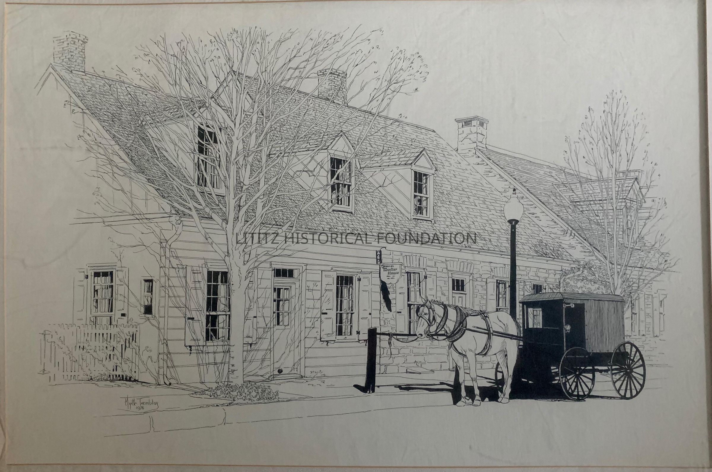 Sketch by Myrtle Tremblay of a Horse and buggy tied in front of the Mueller HouseArtwork Details
