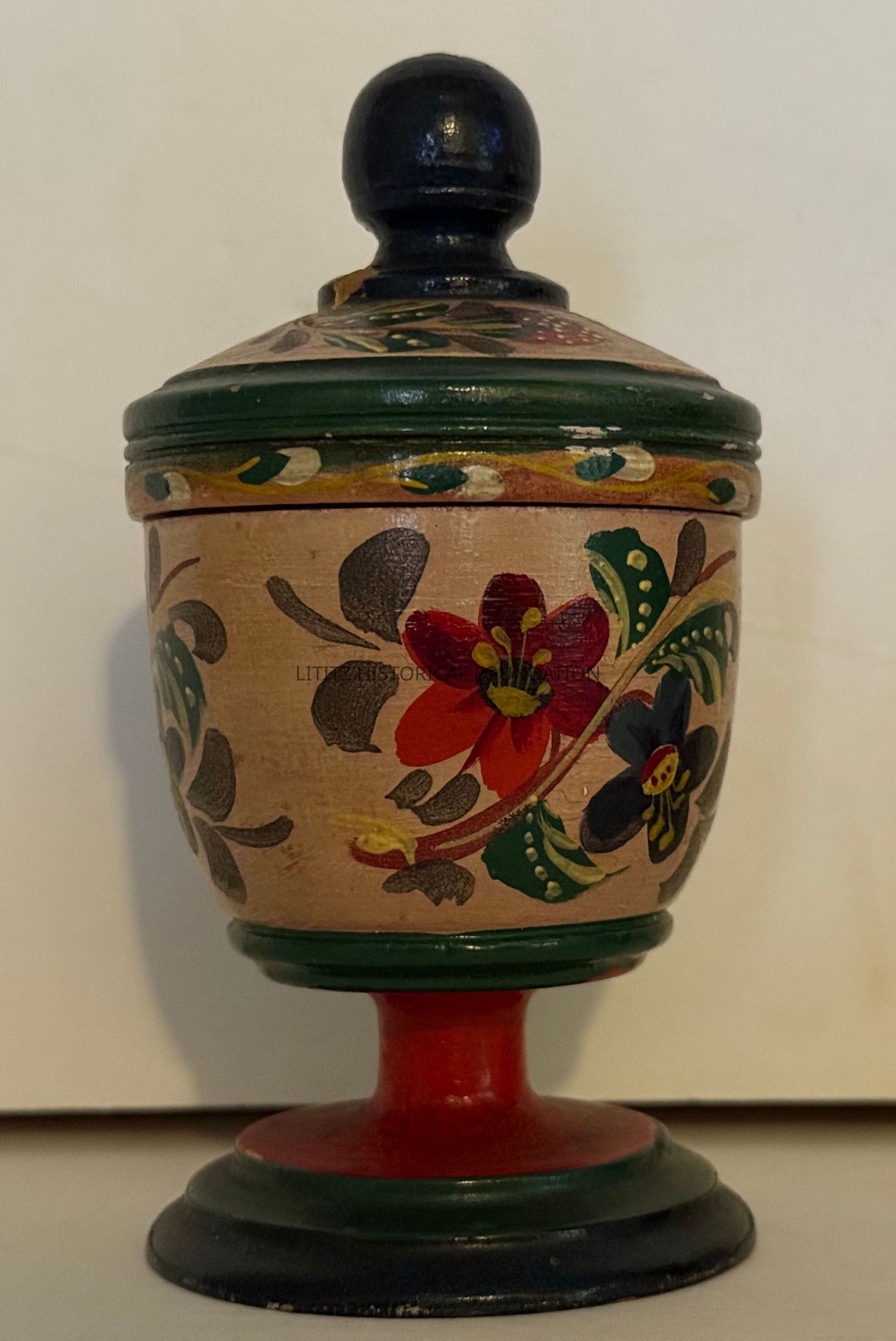 Wooden cup with a base, stem, bowl, and lid. Height measured from the base to the top of the lid. Diameter is of the bowl at its widestHeight