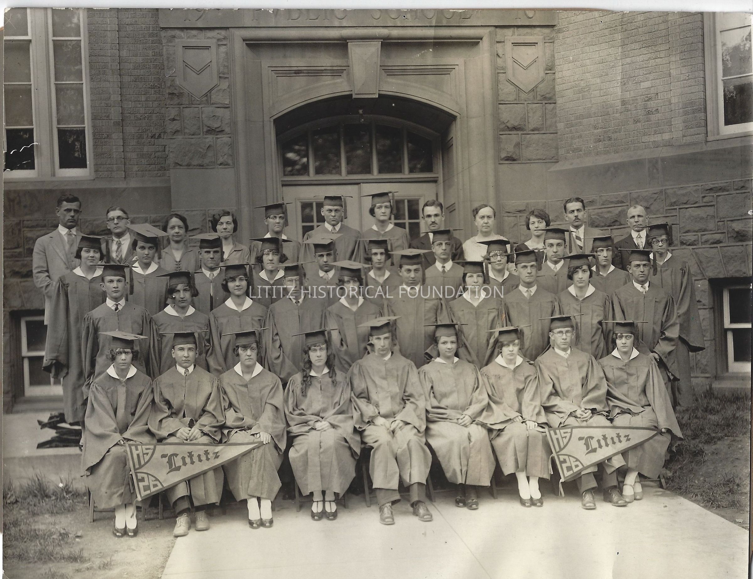 Lititz High School, Class of 1926 wearing their graduation gowns. Photograph of the senior class and faculty was taken in front of the school.Photograph Details