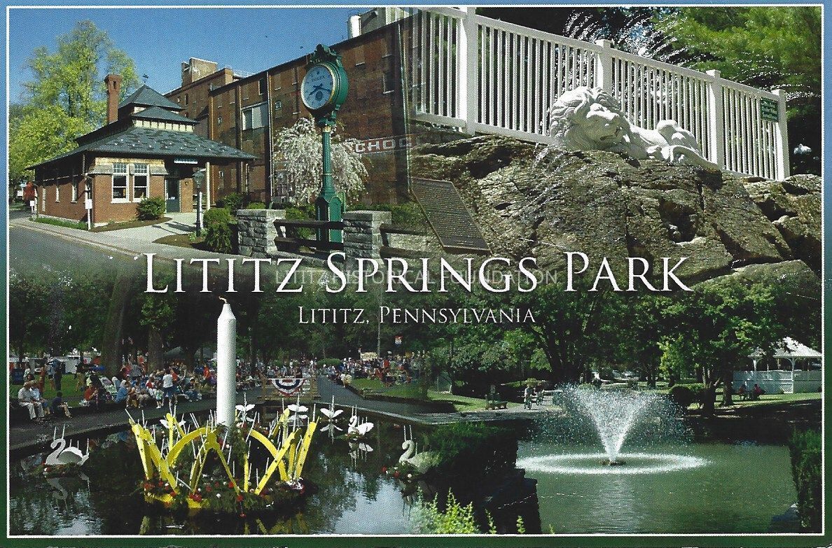 Color postcard with different scenes of Lititz Springs ParkSubject