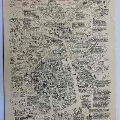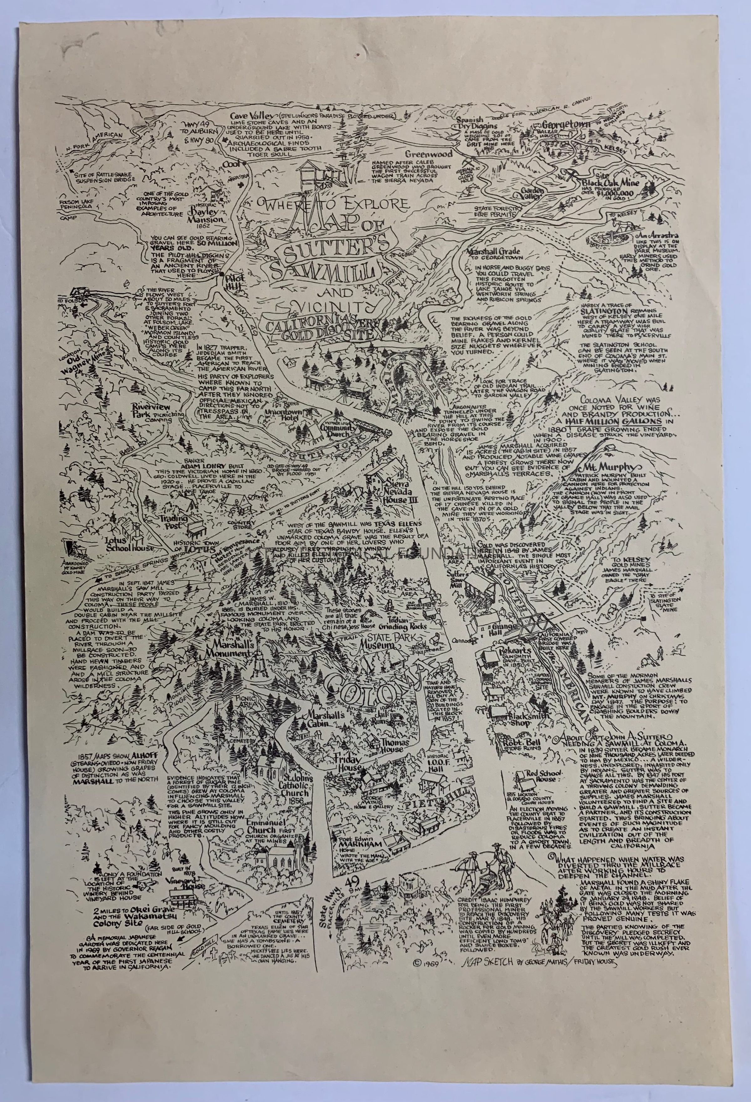 Artist George Mathis enjoyed telling the history of the American West through his art. This drawing of Sutter's Mill and the surrounding towns of the California Gold Rush is one of his later works.Map Details