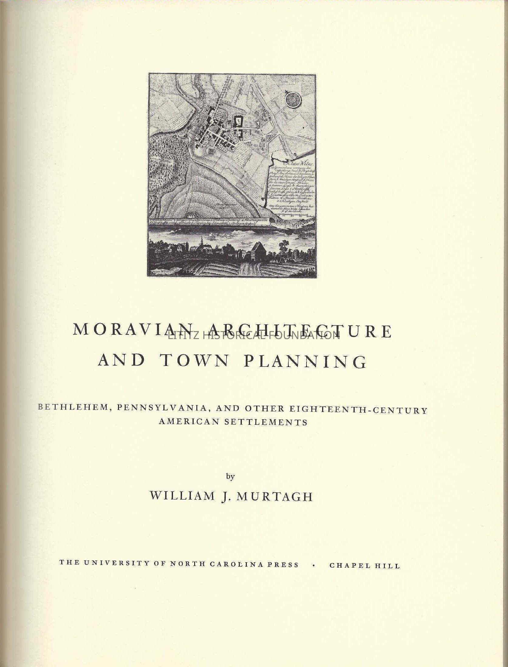 Murtagh's book explores the how Moravian customs and culture influenced the style of buildings and the arrangement of their towns. Much of the book is devoted to Bethlehem. There are shorter examinations of Moravian settlements in Pennsylvania, New Jersey, and North Carolina.Dimensions