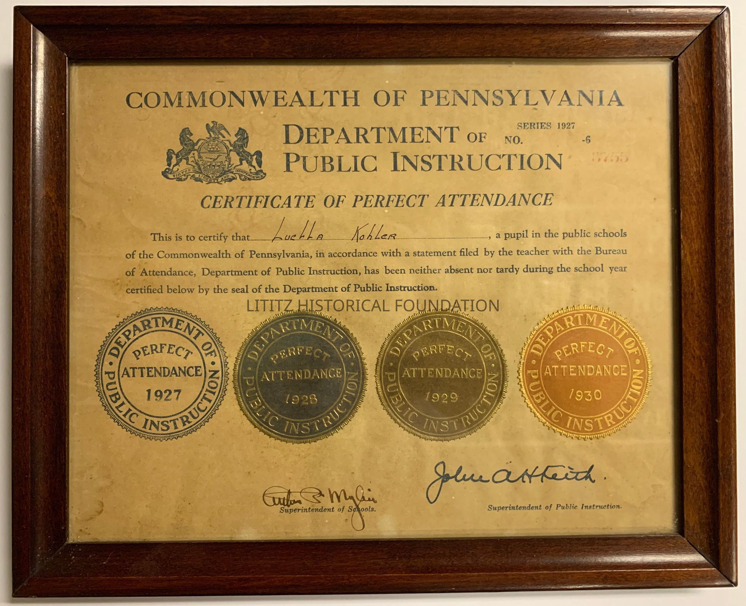 Certificate of Perfect attendance for Leulla Kohler, Rothsville High School, 1927, 1928, 1929, and 1930Dimensions