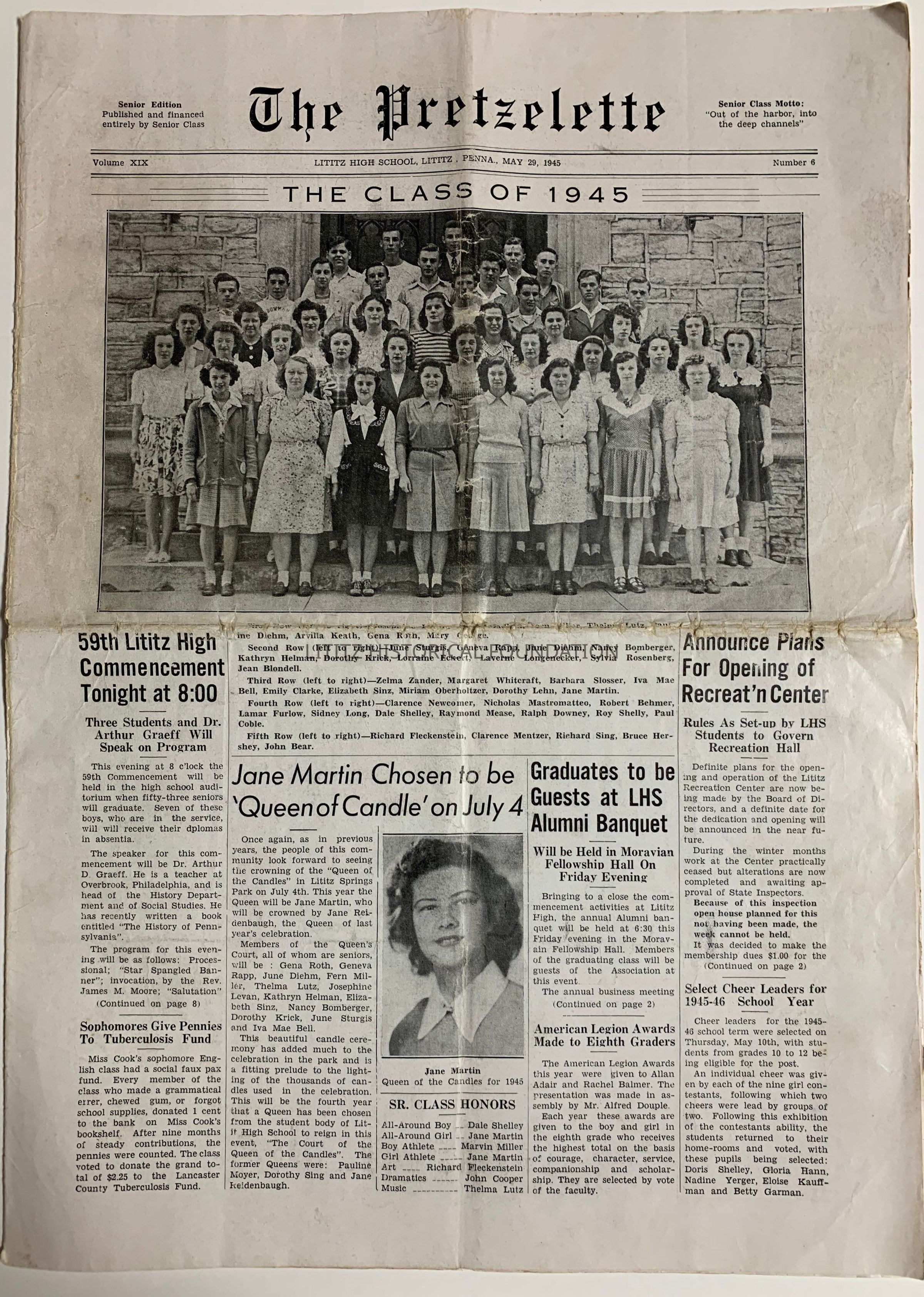 This selection contains 10 issues of the Lititz High School Student Newspaper, The Pretzellette. It spans November 1943 to the graduation issue for May 29, 1945.Collection