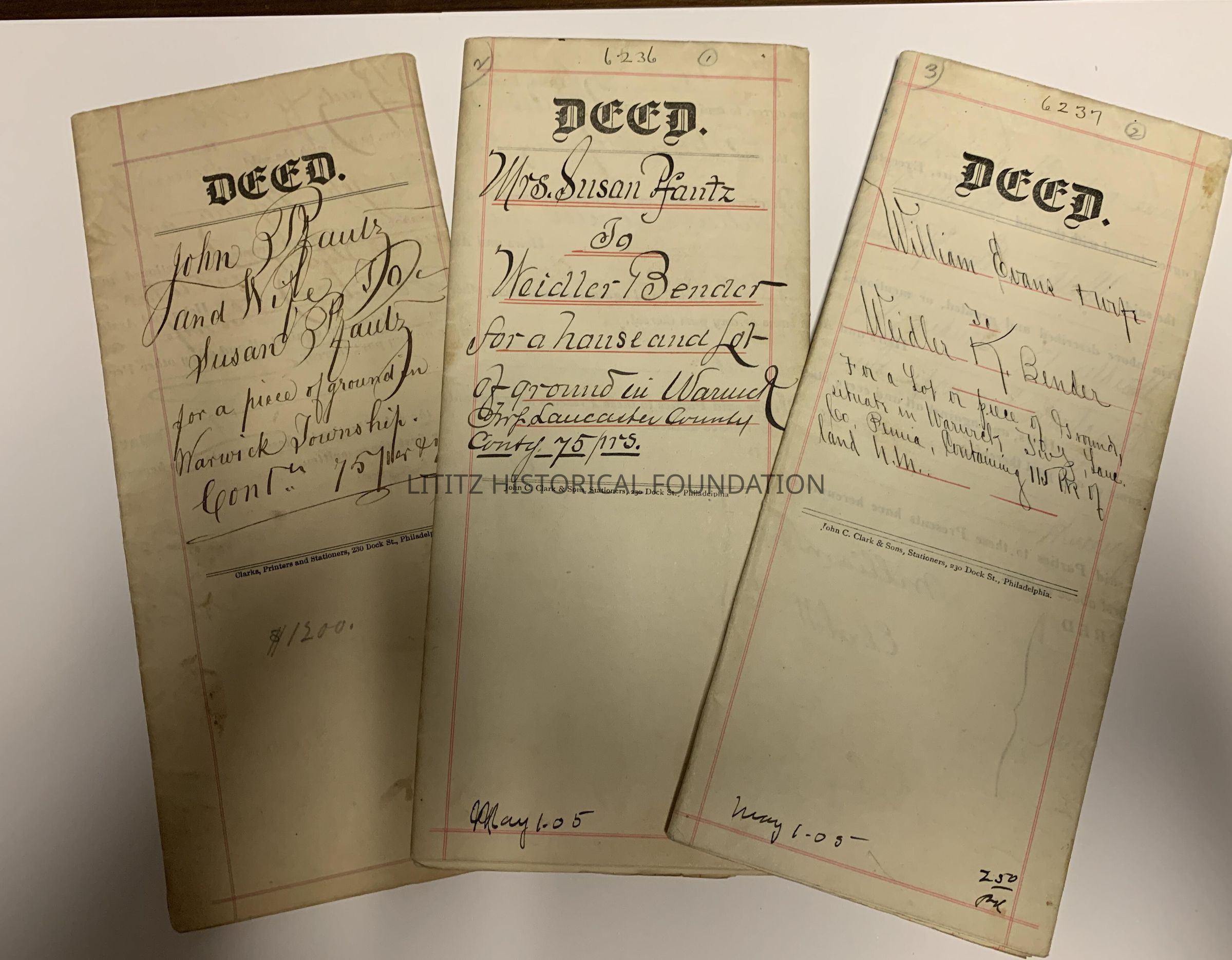 Three property deeds for 511 E. Main St. Lititz. This was the site of Weidler Bender's farm and veterinary practice in LititzCreate Date
