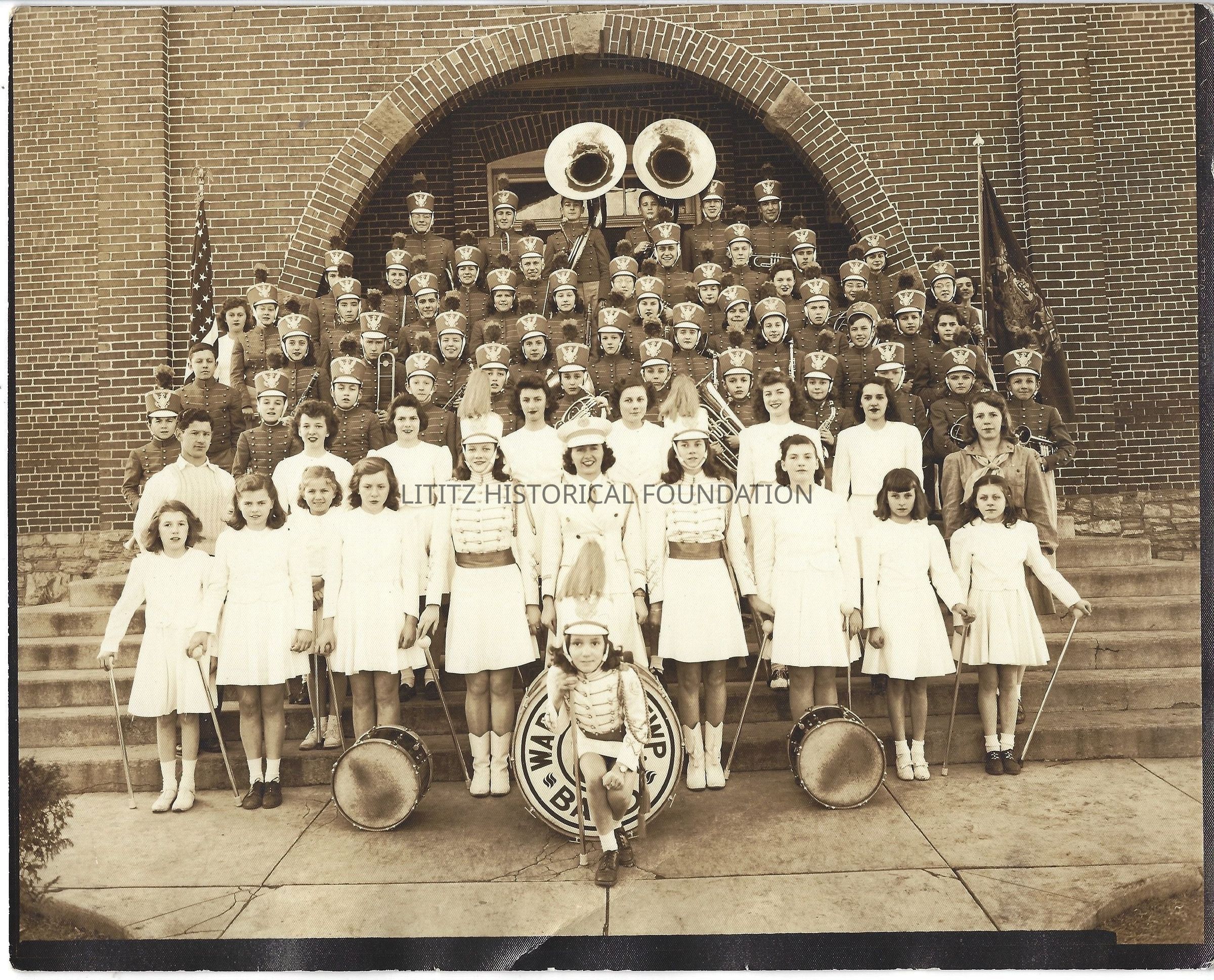 Photograph of the Warwick Township Band in front of Rothsville School, 1944Photograph Details