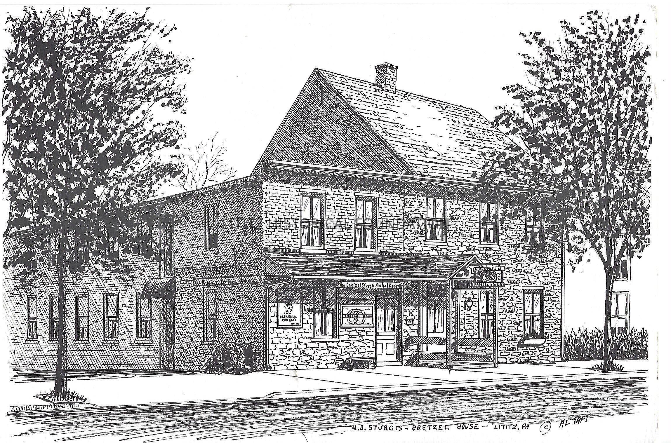 Black and white drawing of N. D. Sturgis Pretzel House, Lititz, PAArtwork Details