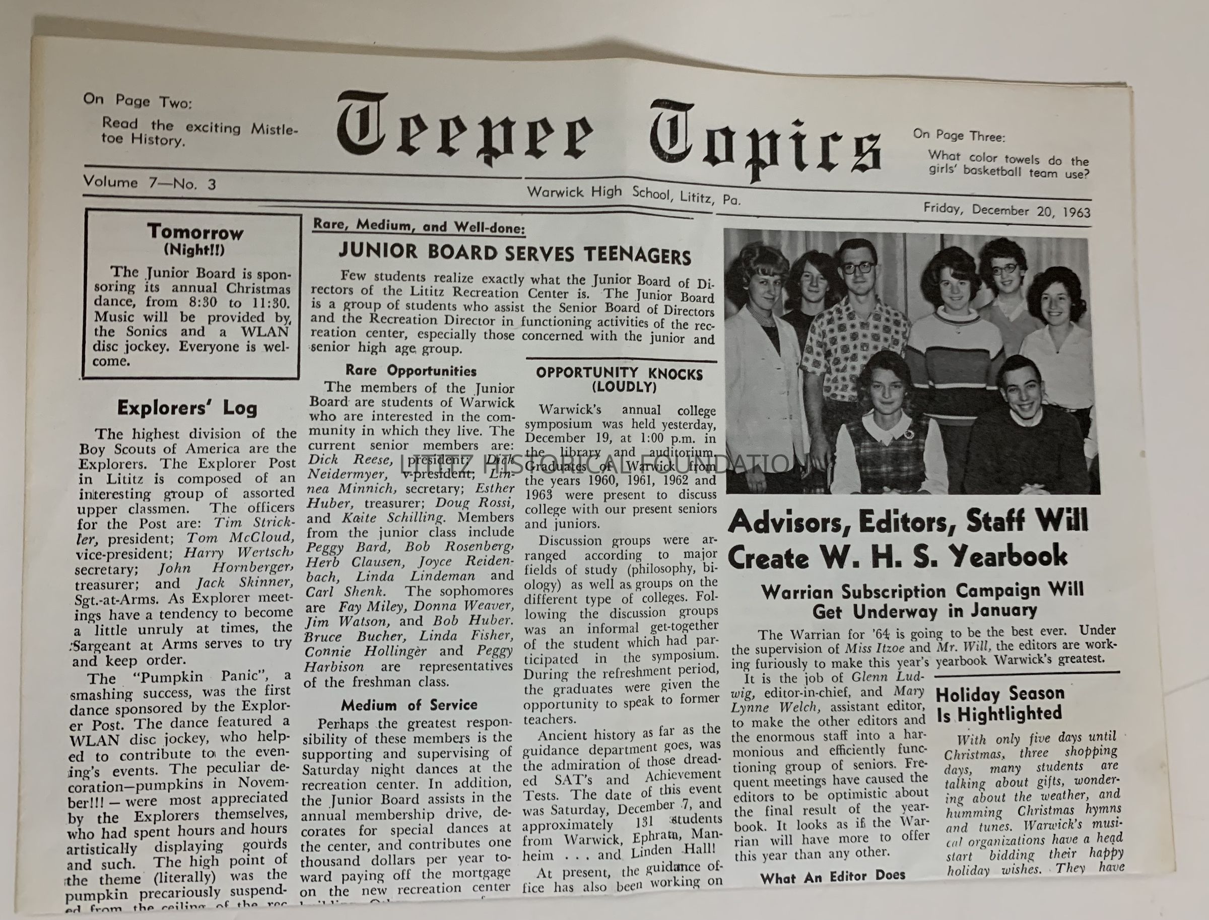 Teepee Topics, Student newspaper for Warwick High School. There are 7 issues spanning 1963 to 1966