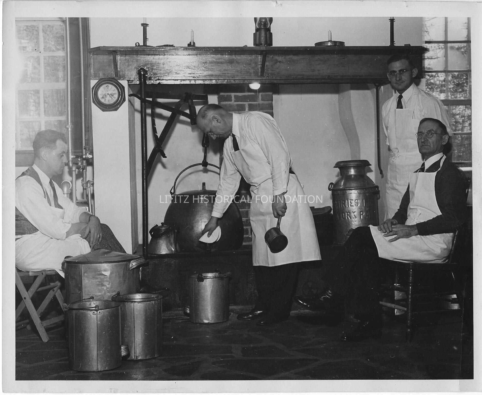 The photograph shows Harry Adams, Frank Showers, an unidentified man, and Adam Showers preparing for a lovefeast.Photograph Details