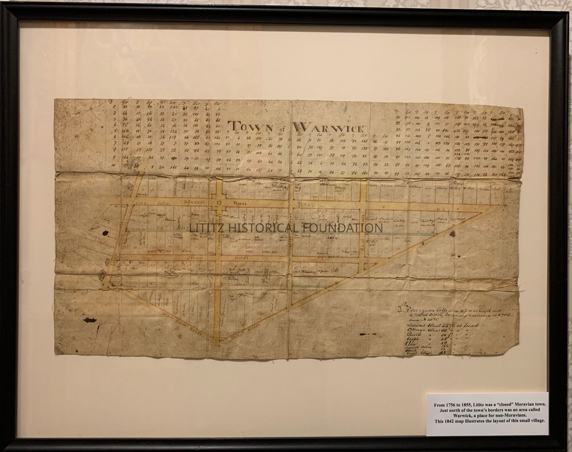 This 1842 map of the town of Warwick shows streets and lots north of present day Lititz creek. At this time, Warwick and Lititz were two separate villages.Collection