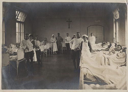 Interior view of a men's hospital ward. Men in jodphurs and white coats stand with nurses at the ends of iron beds. There is a crucifix on the wall at the end of the ward. The ward may be in France.Photograph Details