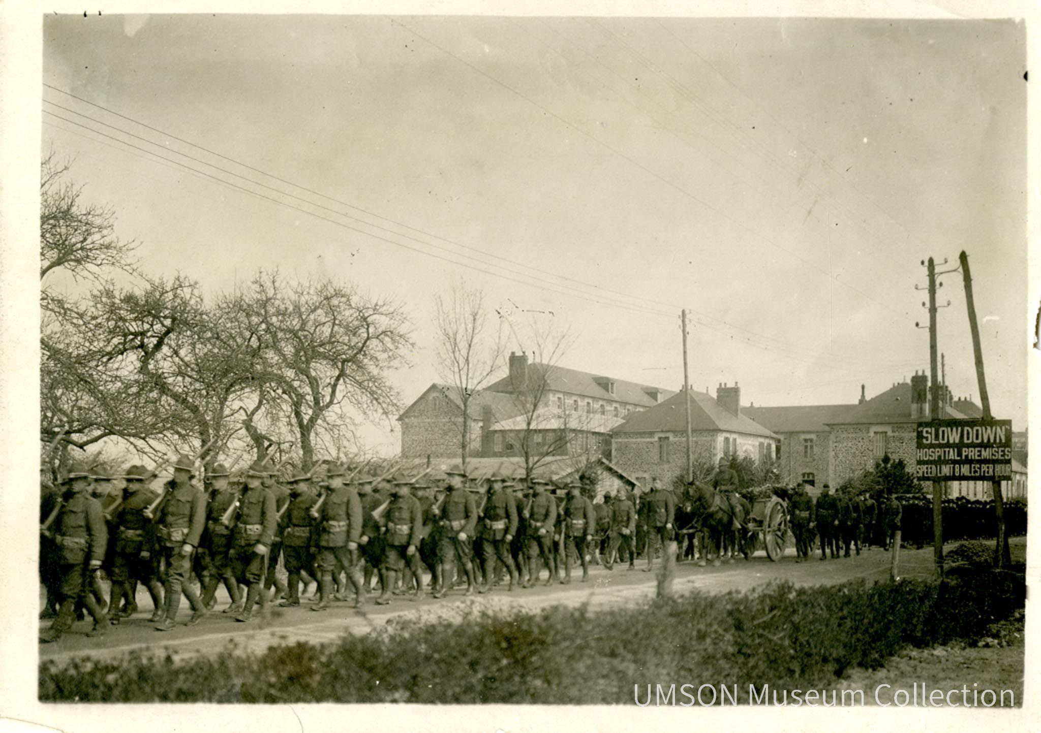A troop of soldiers march down a road ahead of a horse-drawn hearse followed by more troops. The soldiers process in front of the stone buildings of Base Hospital #8, Savenay, France. The hearse carries Jane Delano, a chief in the American Red Cross Department of Nursing, who passed away April 15, 1919, while in France.Photograph Details