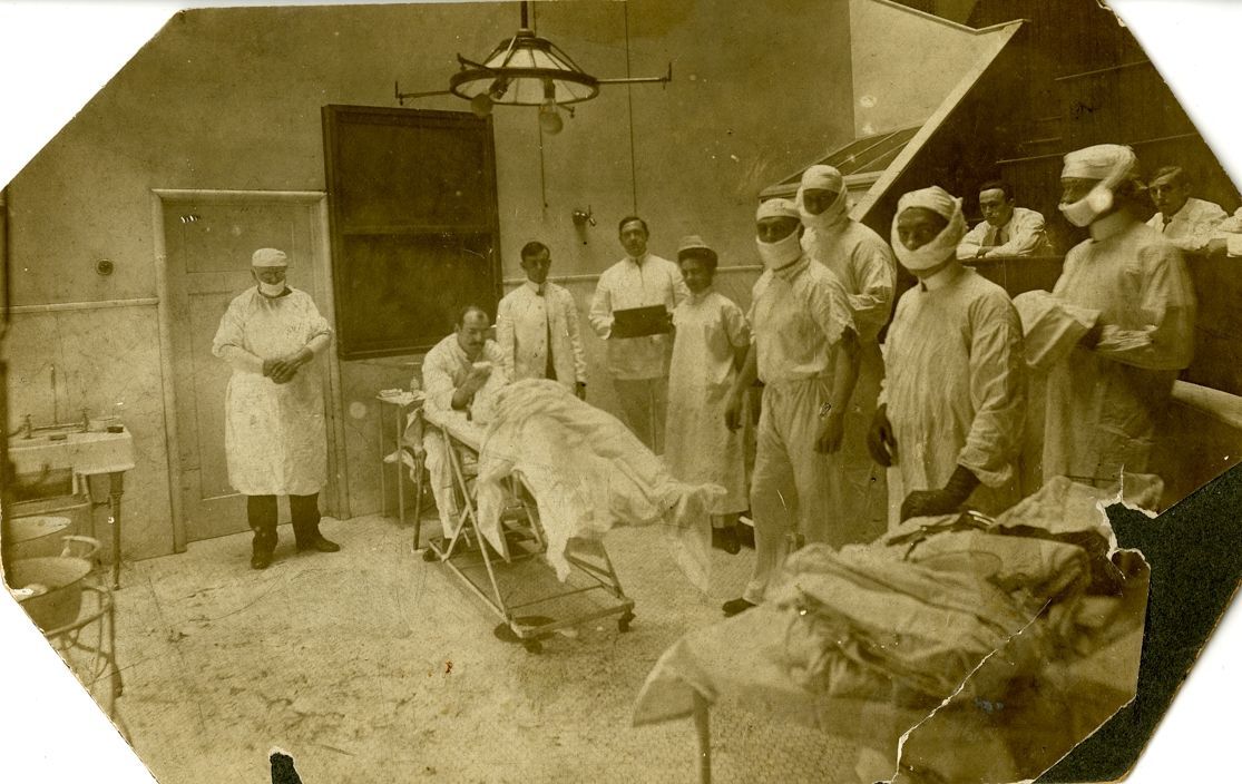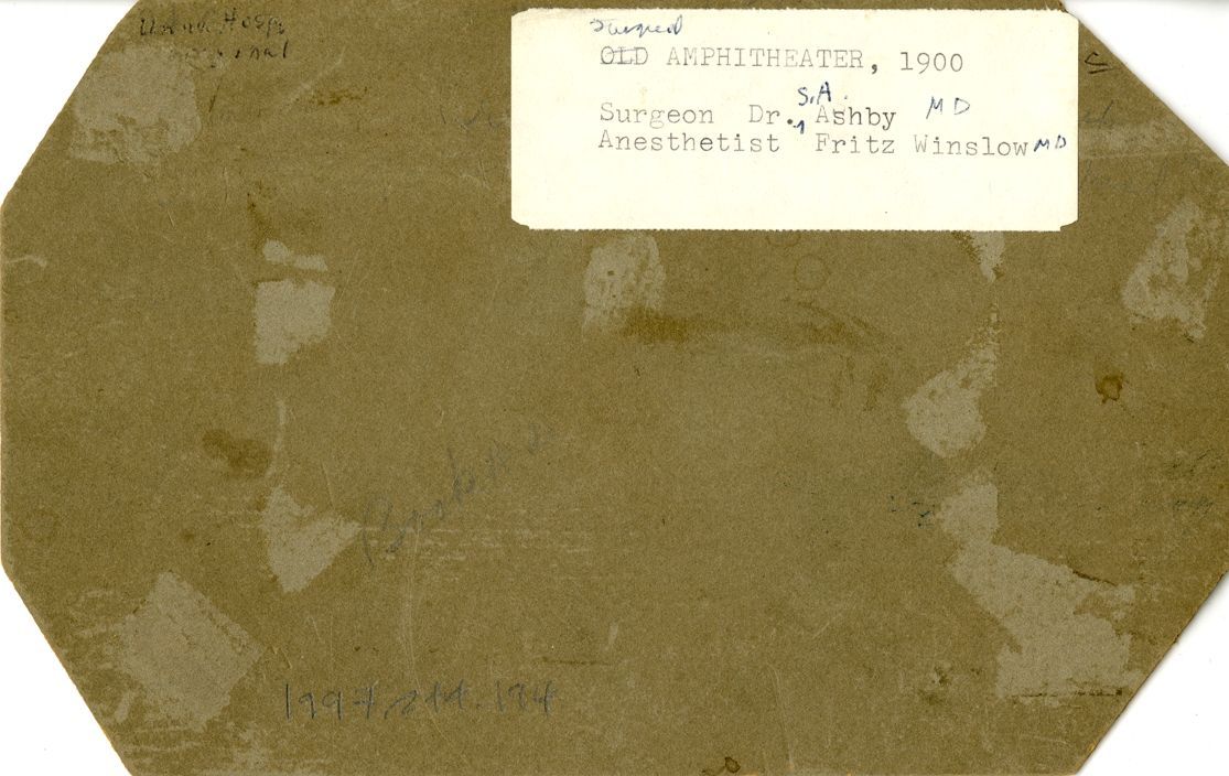 A view from the floor of the surgical ampitheatre of University Hospital shows 9 medical staff (physicians, anesthetist, nursing student, and orderlies) standing behind and alongside a patient lying on a gurney; they are observed by two men in the stands. One surgeon is dressed in white drawstring trousers, a pull-over shirt, mask and cap, while the others wear long-sleeve white gowns over street clothes, with caps and masks. Two physicians wear gloves. The nursing student wears a student cap along with a short-sleeved gown over her uniform. A table with folded clothes or sheets sits in the foreground; the hexagonal tile floor is dirty and smeared, probably with blood. The anesthetist is identified as Dr. Fritz Winslow; the surgeon is Dr. S. A. Ashby.Photograph Details