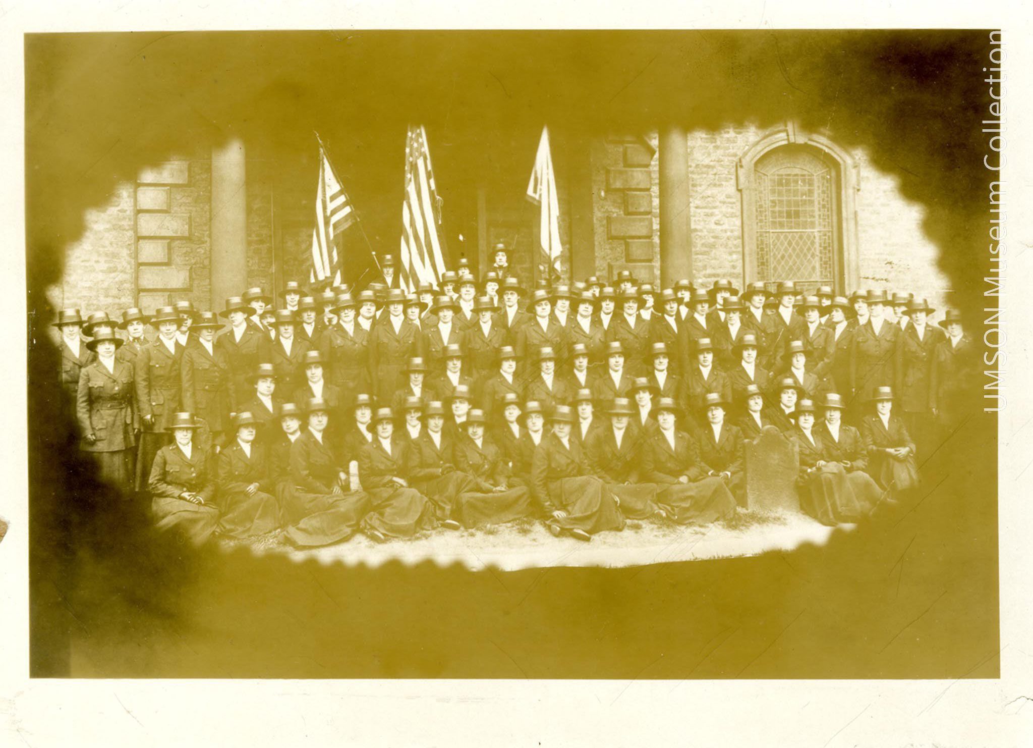 Group photo of University of Maryland Nurses taken outside Trinity Church on Wall Street in Manhattan after the consecraation of their colors. The nurses were assigned to U. S. Army Base Hospital #4 during World War I.Photograph Details