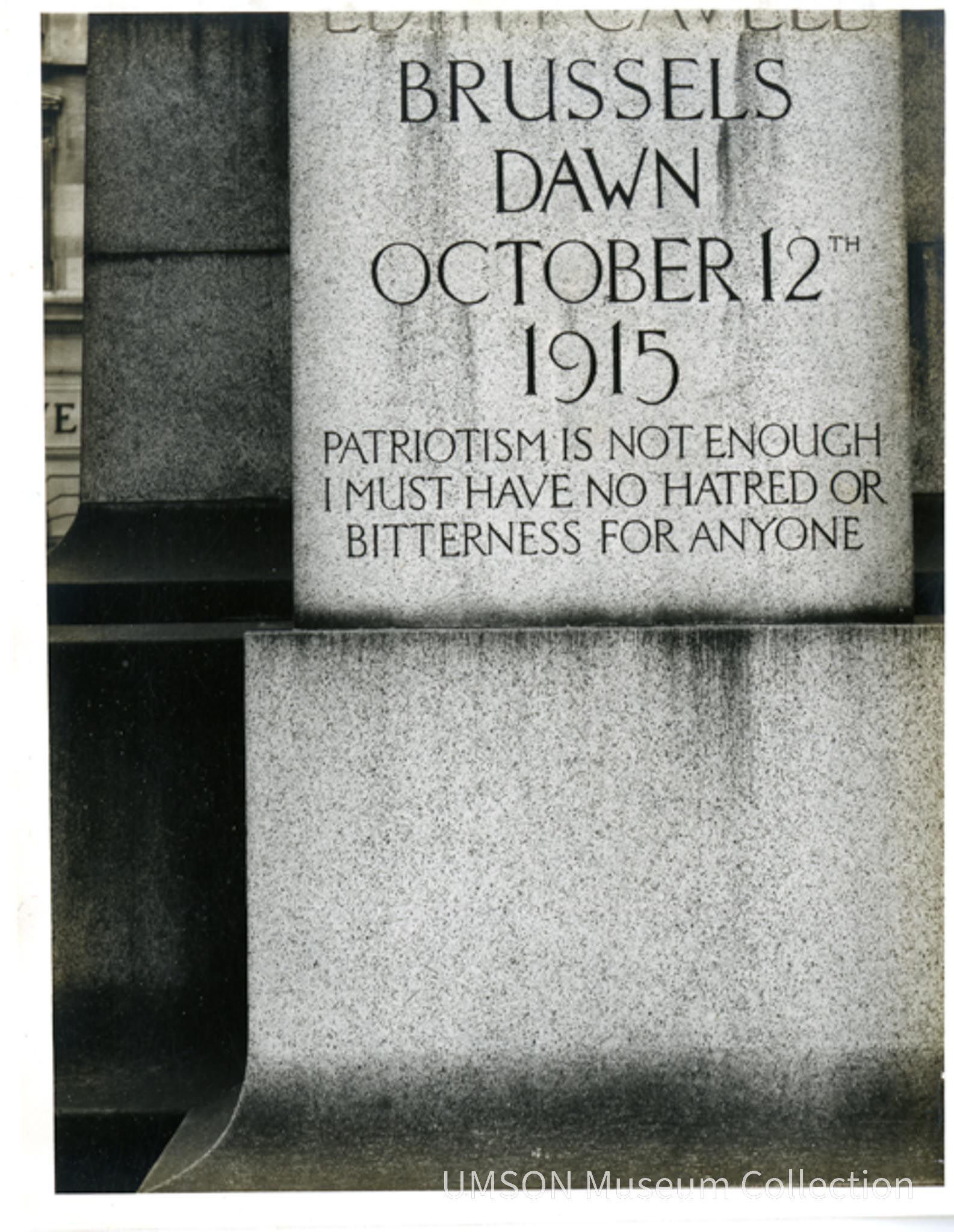 Detail of inscription on Edith Cavell Memorial, London, noting her time of execution "Dawn, October 12th, 1915" and her last words: Patriotism is not enough. I must have no hatred or bitterness for anyone."Photograph Details