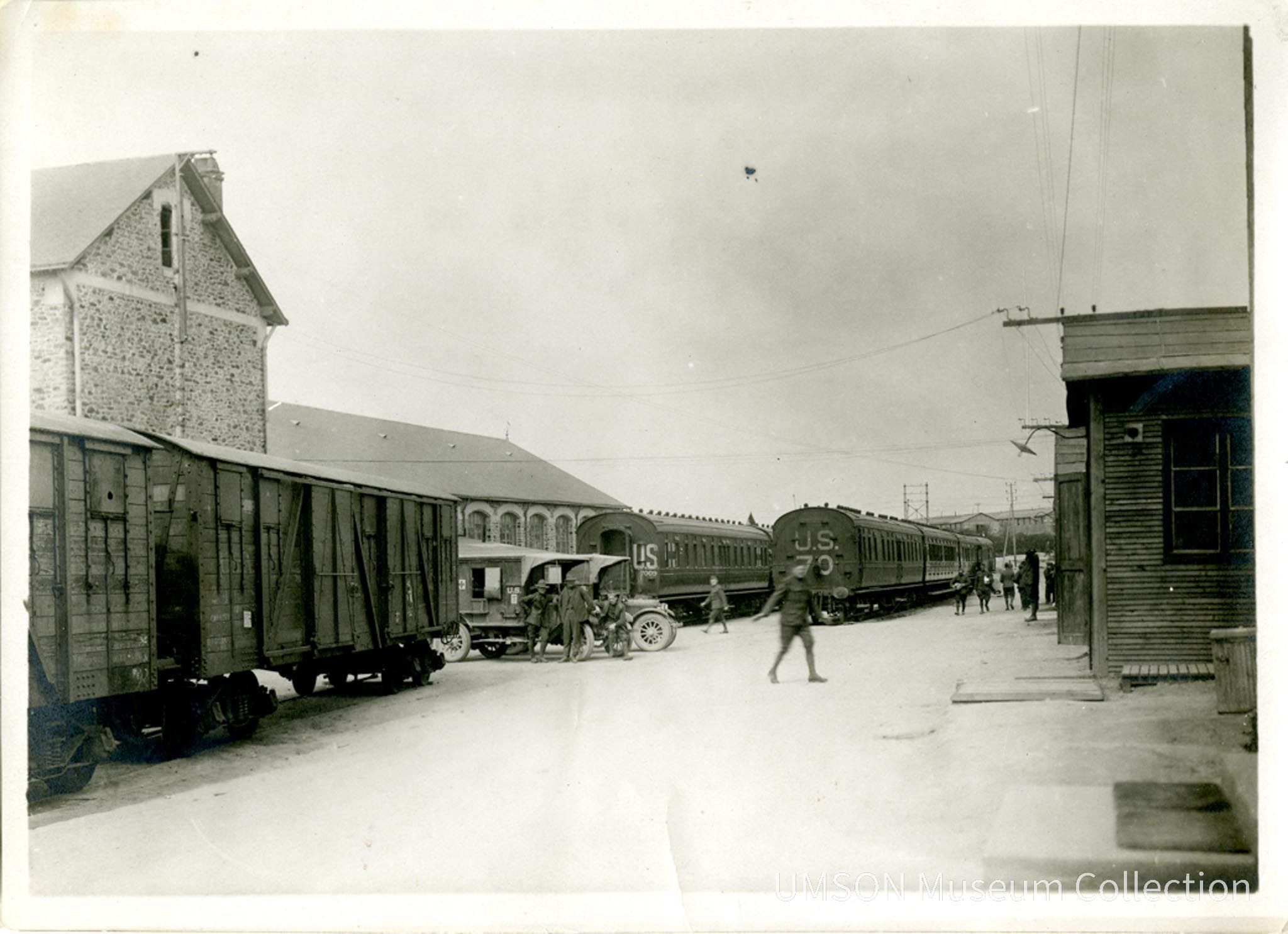 View of freight trains and cars in the rail yard of Base Hospital 69, Savenay, France. Behind the freight cars stands the stone building used as the Nurses' Home. Anna C. Robinson (DIN 1917) served at Base Hospital 69 with the American Red Cross, 1918-1919.Collection