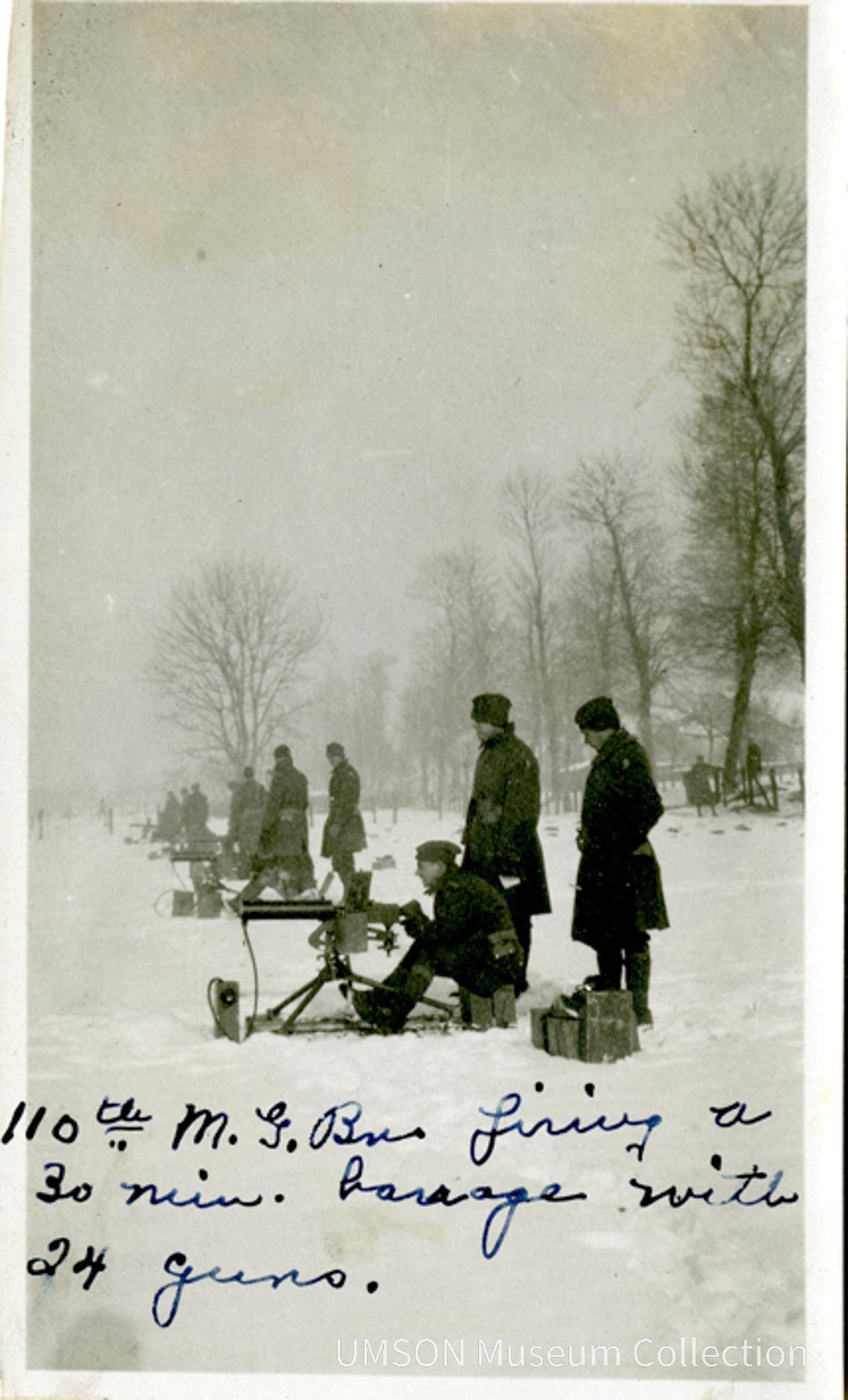Soldiers of the 110th Machine Gun Battalion in a row in the snow. Individual soldiers are seated at machine guns, with two soldiers standing behind each gun. Five groups are visible. The photo was probably made near Charney-sur-Meuse, a village near Verdun and partially destroyed in the Meuse-Argonne offensive of September-November 11, 1918. The 110th was part of the 29th Division.Photograph Details