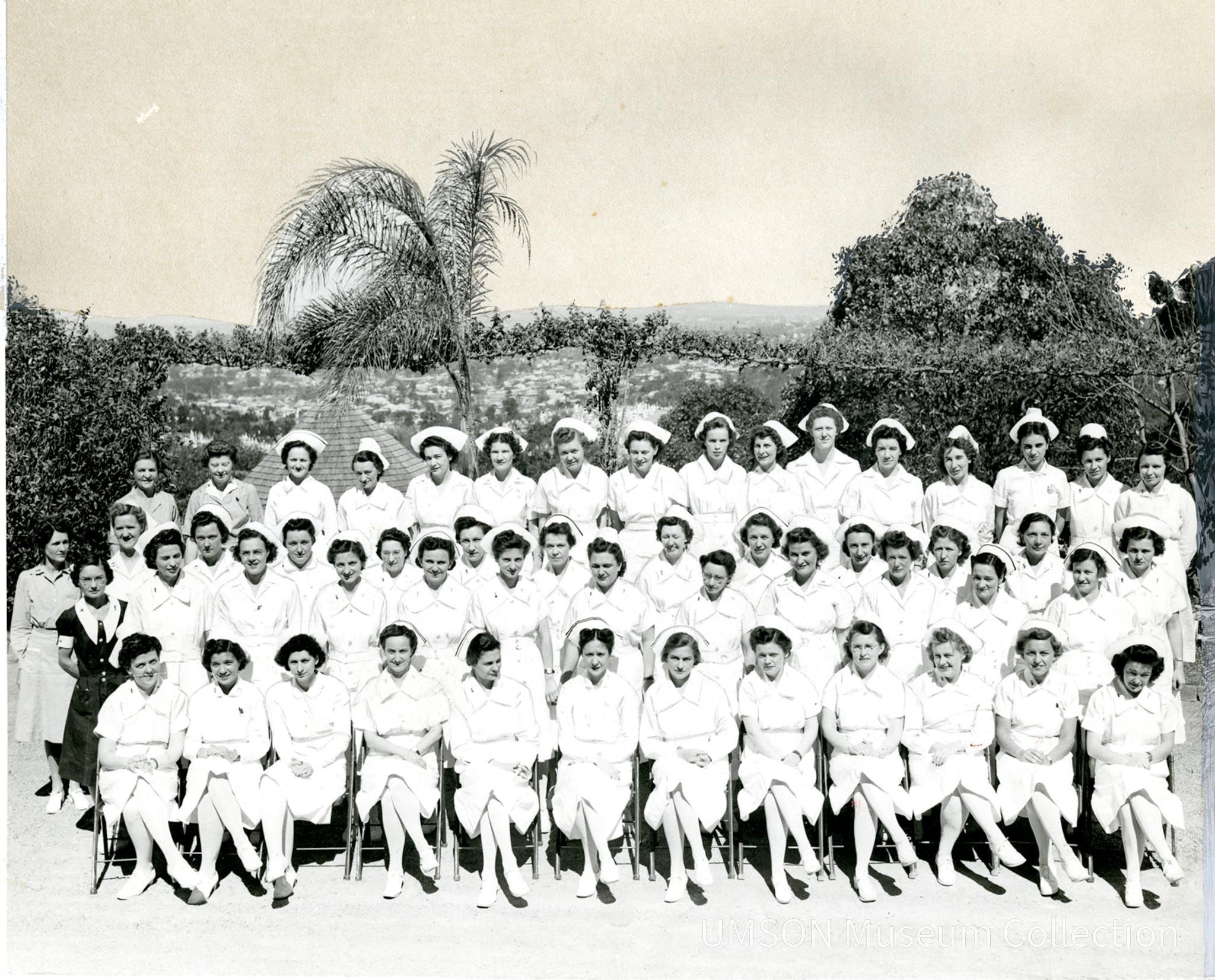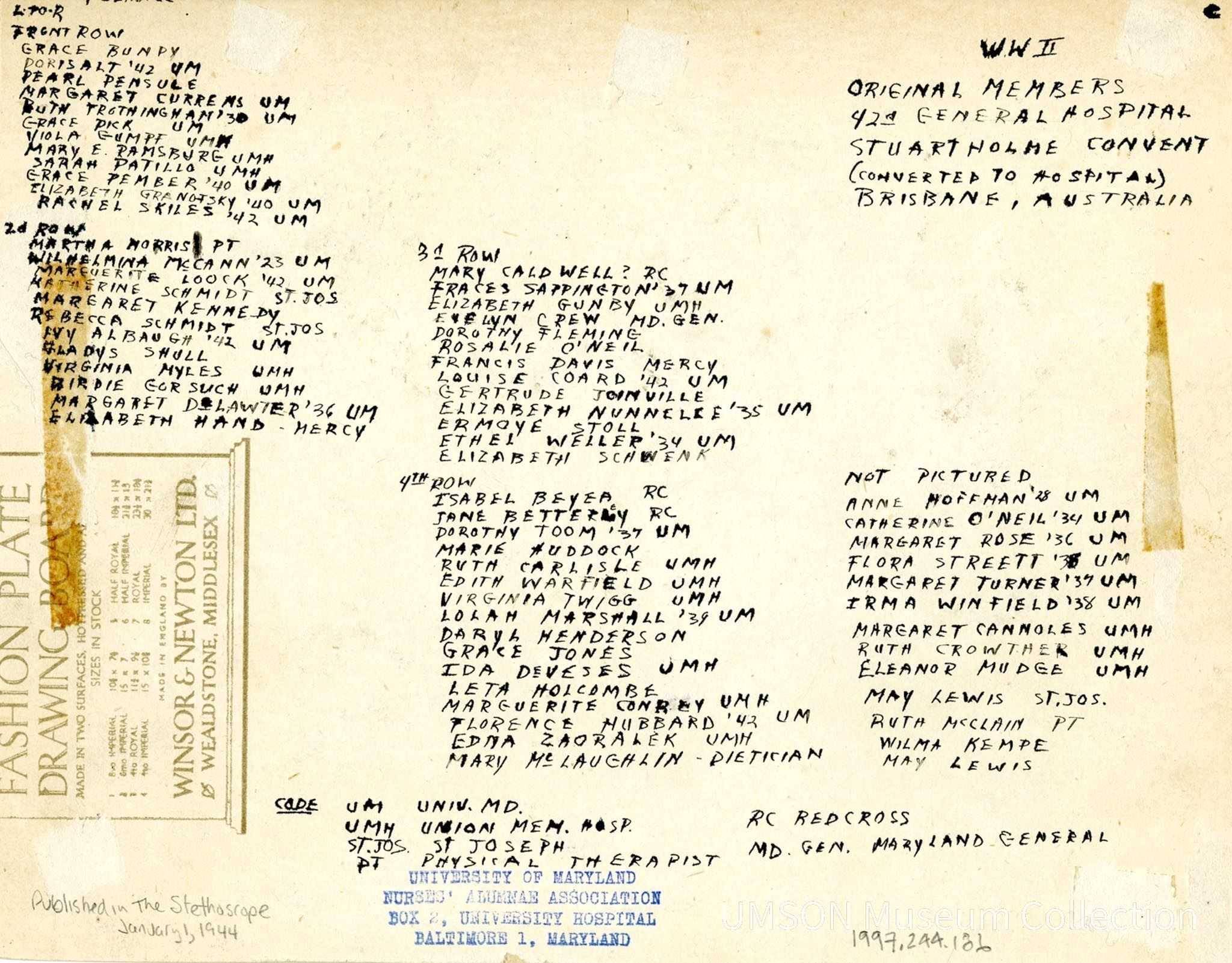 WWII Original Members 42nd General Hospital Stuartholme Convent (Converted to Hospital) Brisbane, Australia. L to R Front Row Gace Bundy; Doris Alt '42 UM; Pearl Pensule; Margaret Currens UM; Ruth Frothingham '30 UM; Grace Dick UM; Viola Gumpf UMH; Mary E. Ramsburg UMH; Sarah Patillo UMH; Grace Pember '40 UM; Elizabeth Granofsky '40 UM; Rachel Skiles '42 UM; 2nd Row Martha Morris PT; Wilhemina McCann '23 UM: Marguerite Loock '42 UM: Katherine Schmidt St. Jos; Margaret Kennedy; Rebecca Schmidt St. Jos; Ivy Albaugh '42 UM; Gladys Shull; Virginia Myles UMH; Birdie Gorsuch UMH; Margaret Delawter '36 UM; Elizabeth Hand Mercy; 3rd Row Mary Caldwell ? RC; Frances Sappington '37 UM; Elizabeth Gunby UMH; Evelyn Crew MD. Gen.; Dorothy Fleming; Rosalie O'Neil; Francis Davis Mercy; Louise Coard '42 UM; Gertrude Johnville; Elizabeth Nunnelee '35 UM; Ermoye Stoll; Ethel Weller '34 UM; Elizabeth Schwenk; 4th Row Isabel Beyer RC; Jane Betterley RC; Dorothy Toom '37 UM; Marie Huddock; Ruth Caarlisle UMH; Edith Warfield UMH; Virginia Twigg UMH; Lolah Marshall '39 UM; Daryl Henderson; Grace Jones; Ida Deveses UMH; Leta Holcombe; Marguerite Conrey UMH; Florence Hubbard '42 UM; Mary McLaughlin- Dietician Code: UM Univ. MD.; UMH Union Mem. Hosp. St. Jos St Joseph; PT Physical Therapist; RC Red Cross; MD. Gen. Maryland General Not Picture: Anne Hoffman '28 UM: Catherine O'Neil '34 UM; Margaret Rose '36 UM; Flora Street '38 UM; Margaret Turner '37 UM; Irma Winfield '38 UM; Margaret Cannoles UMH; Ruth Crowther UMH; Eleanor Mudge UMH; May Lewis St. Jos.; Ruth McClain PT; Wilma Kempe; May Lewis Published in "The Stethoscope" January 1, 1944Language