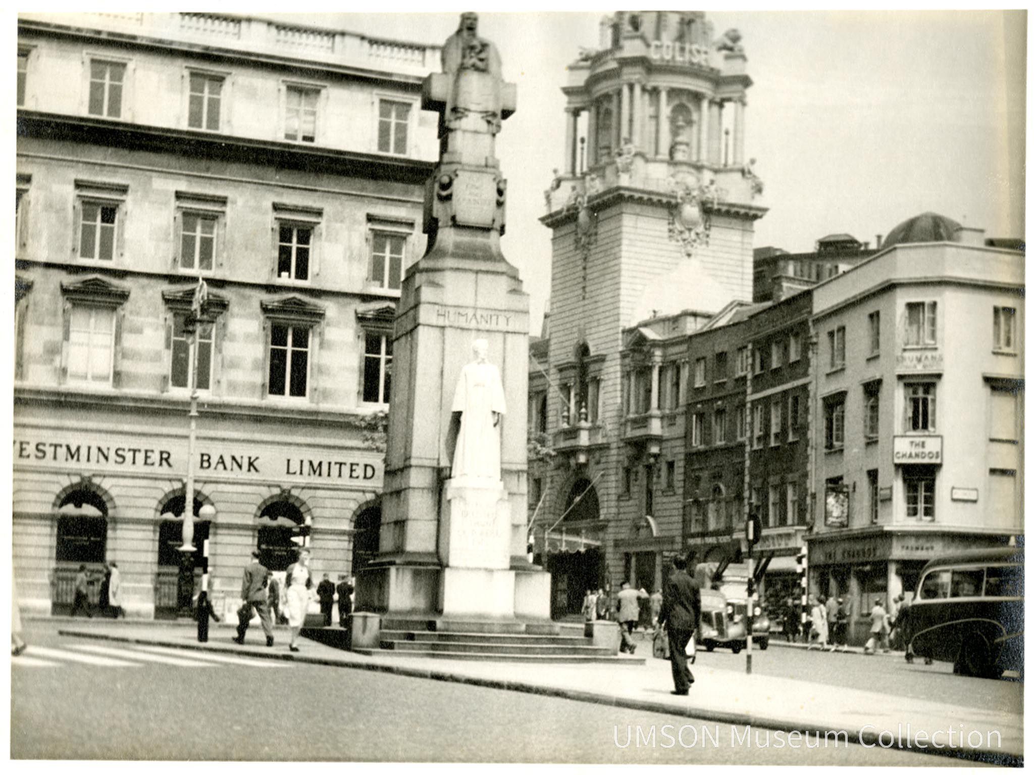 Marble memorial to Edith Cavell, a British nurse killed in Brussels, Belgium, in 1915. A figure of Cavell in nurse's uniform and cloak stands before a pylon inscribed "Humanity" just above Cavell. In the background at left is the Westminster Bank Limited, with arched ground-floor windows. At right are low-rise shops and the Coliseum, with a tower. Men and women walk in the streets in mid-20th century clothes. The memorial is located in St. Martin's Place in London, England.Photograph Details