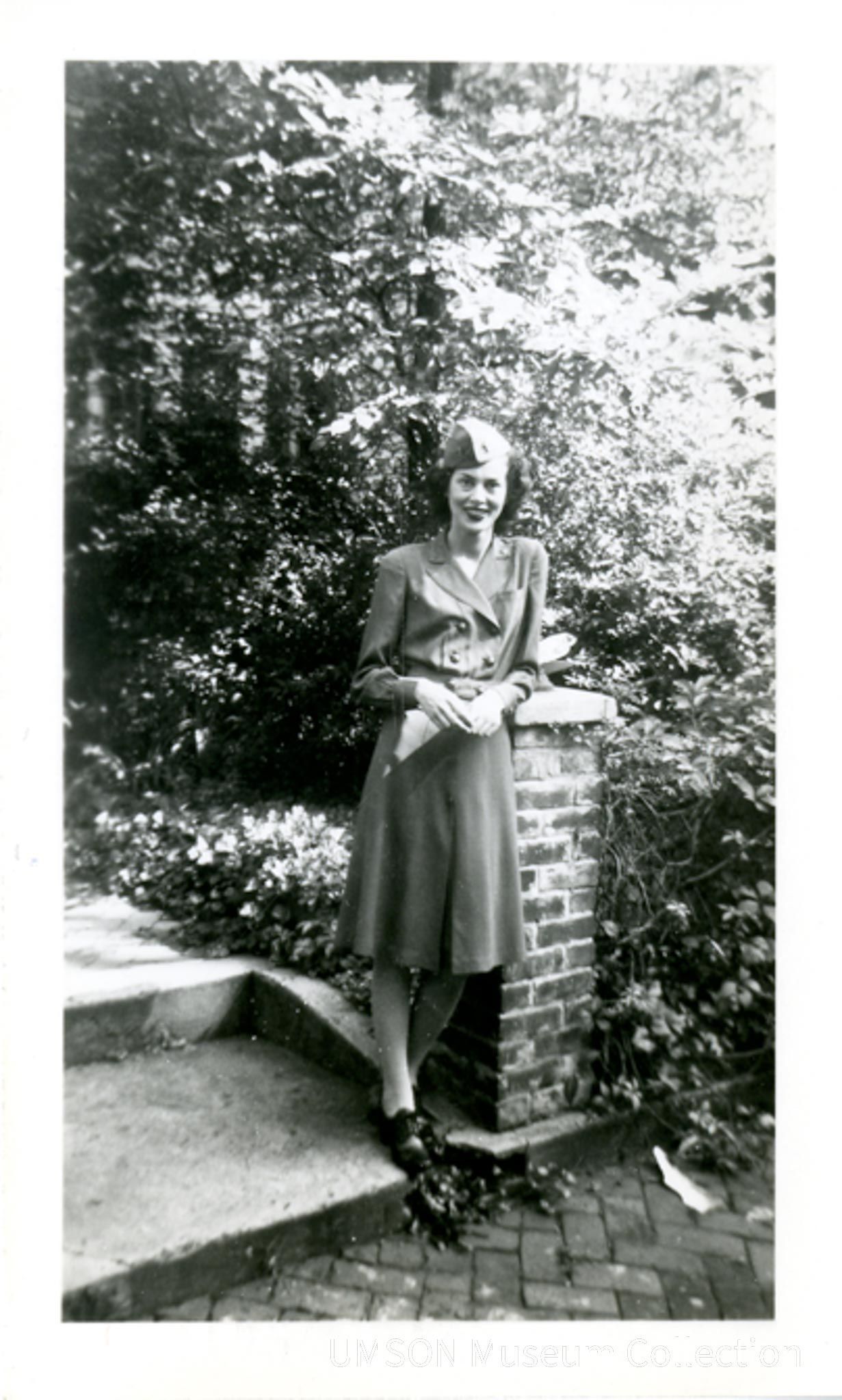 Snapshot of Jane Small Baker (DIN 1942) in U.S. Army Nurse Corps uniform, leaning on a masonry pillar in front of a wooded yard.Photograph Details
