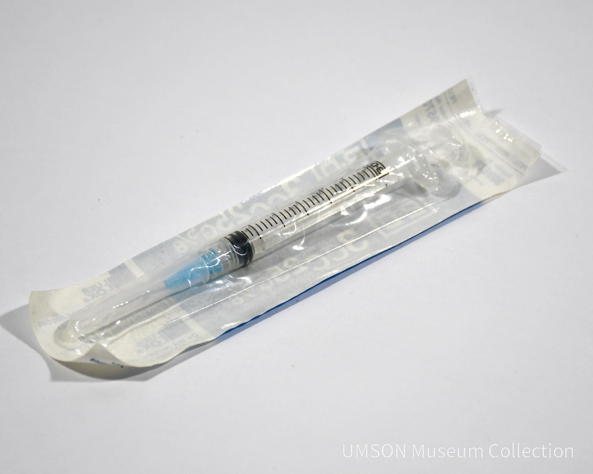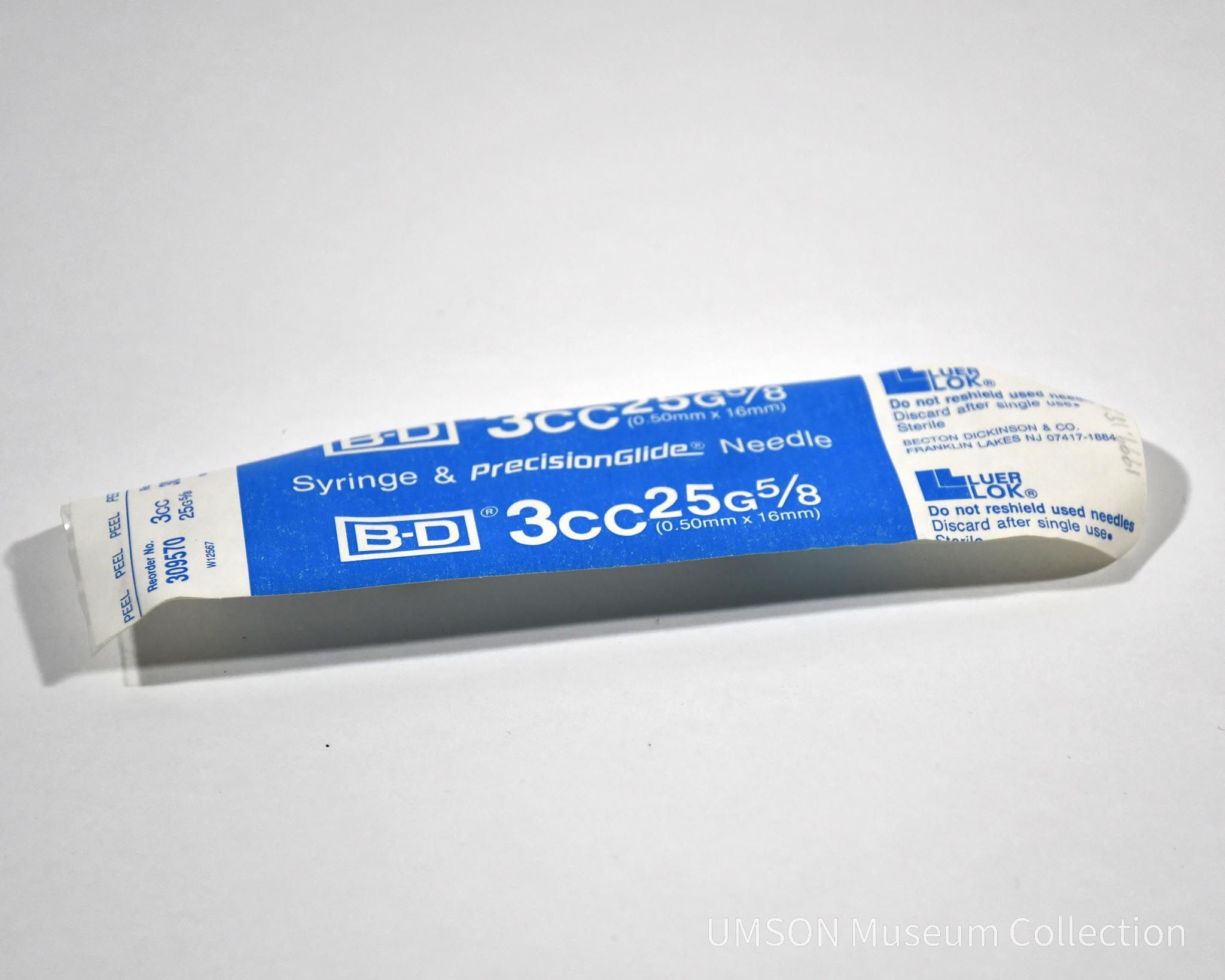 .1 & .2 - Two 3cc 25 G 5/8 disposable syringes with Precision Glide® needles. Clear plastic syringe with black increments printed on it, blue tip covers and blue and white packages.Acquisition