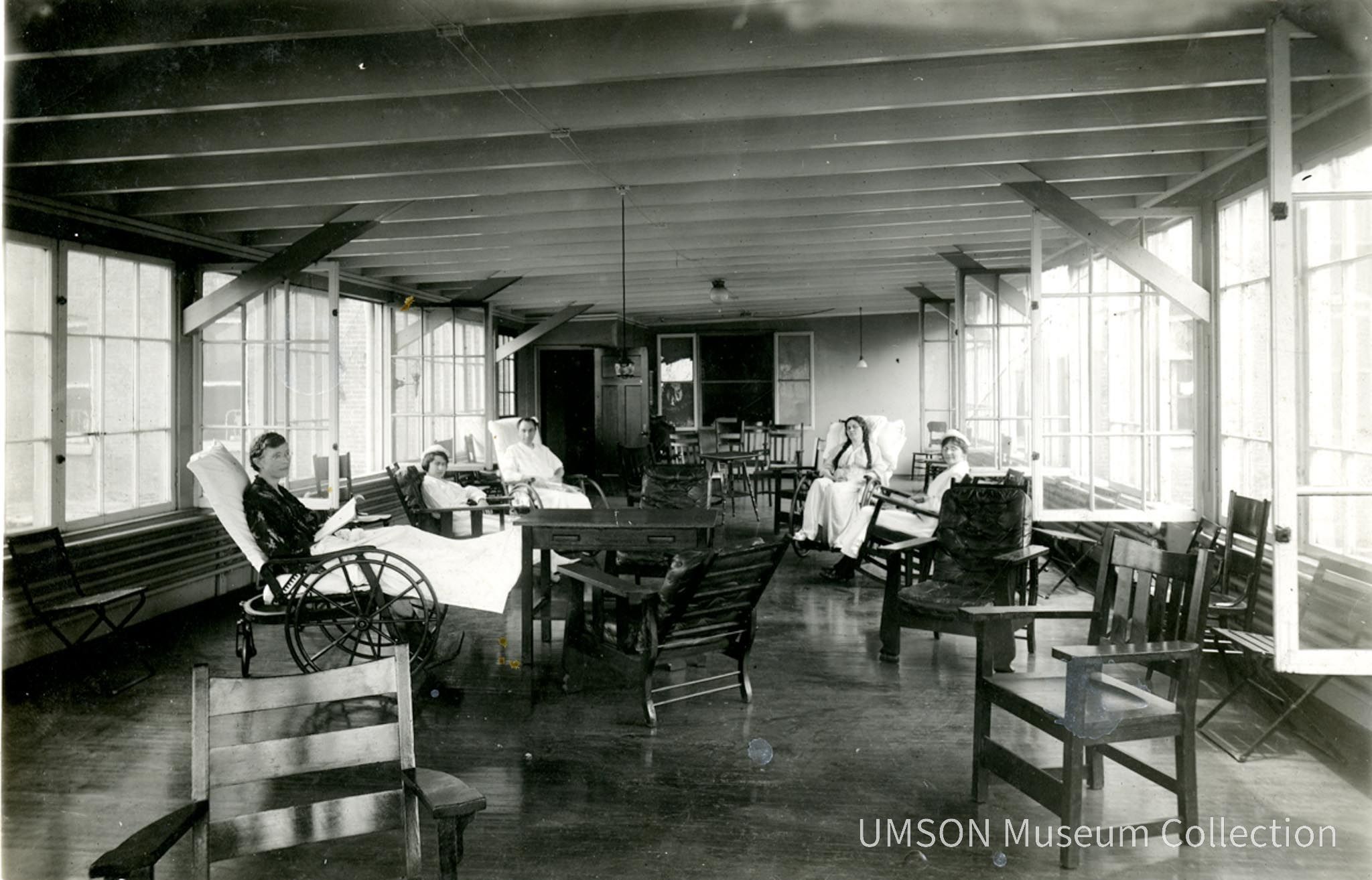 Interior of sun porch with exposed beams in ceiling and open casement windows. Three patients and two nurses are seated: on the left, a woman in a wheelchair reads a magazine; behind her, graduate nurse Caroline Kling, DIN 1919 sits in a wooden chair, with another patient in a wheelchair behind her. On the right, a woman with two long braids sits in a wheelchair. In a wooden rocking chair to her right sits graduate nurse Norma I. Frothingham, DIN 1915.Photograph Details