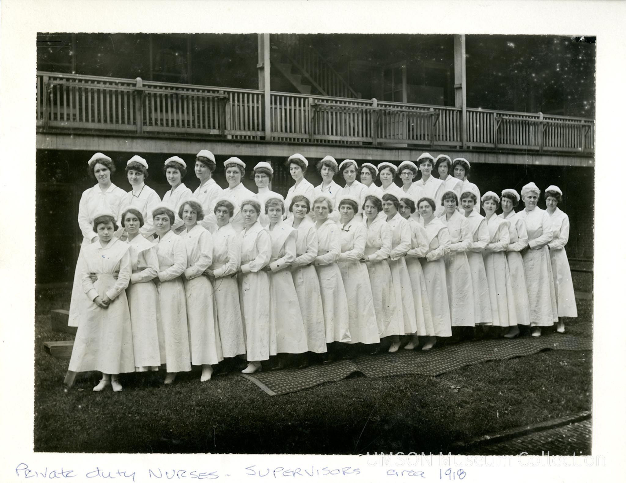 Group photograph of 35 graduate nurses in white dress uniforms, aprons, and caps standing in two rows, hands on waists, in front of a wooden porch.Photograph Details