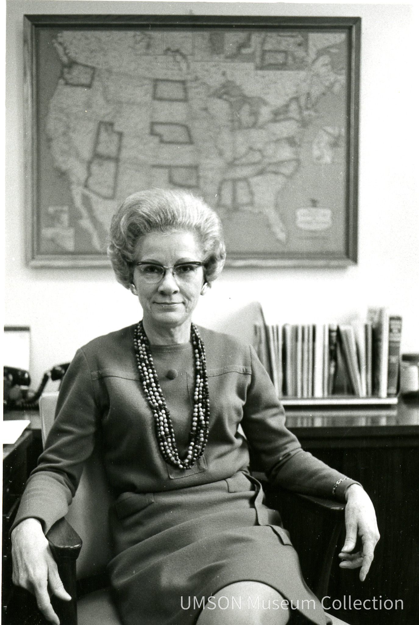 B X W portrait of Marion Murphy, dean of SON from 1966-1978. This shot is taken in front of her desk with a map in the background. She is wearing black frame glasses, an A-line dress, and a beaded necklace.Collection