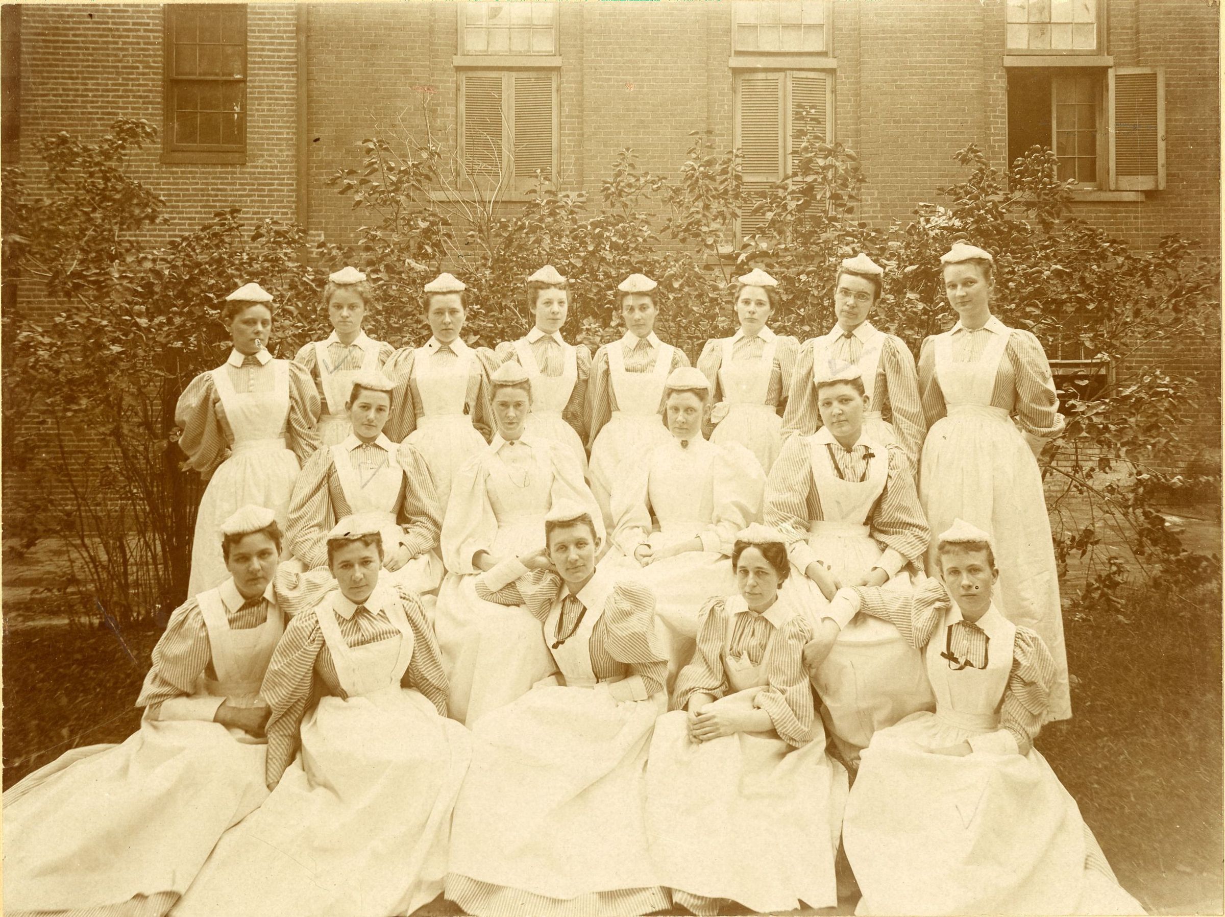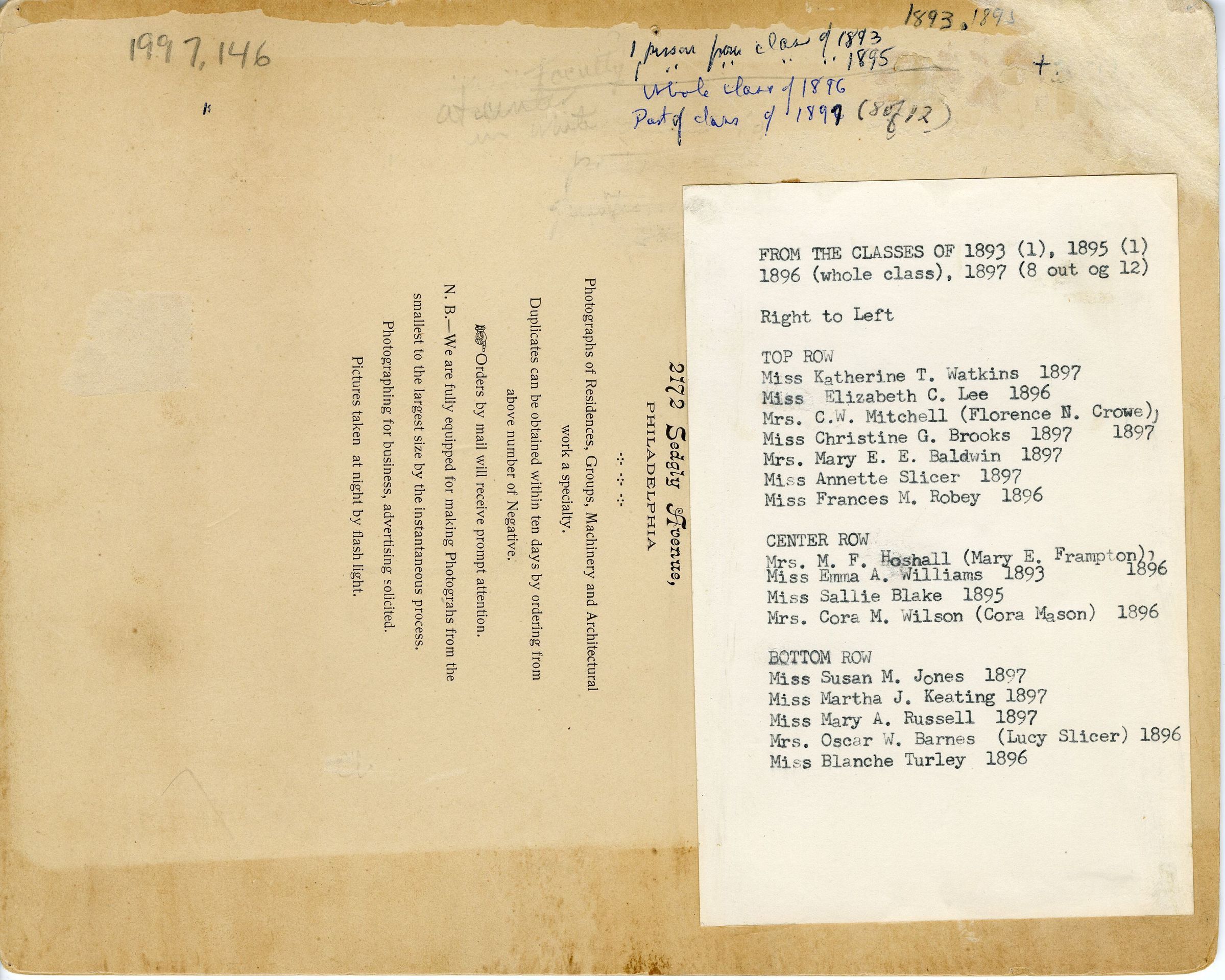 Class portrait of classes 1896-1897 taken with two graduate nurses from the classes of 1893 and 1895. Graduate nurses are seated in white uniforms at center; student nurses are wearing striped uniforms. The photo is mounted on cream-colored mat boardPhotograph Details
