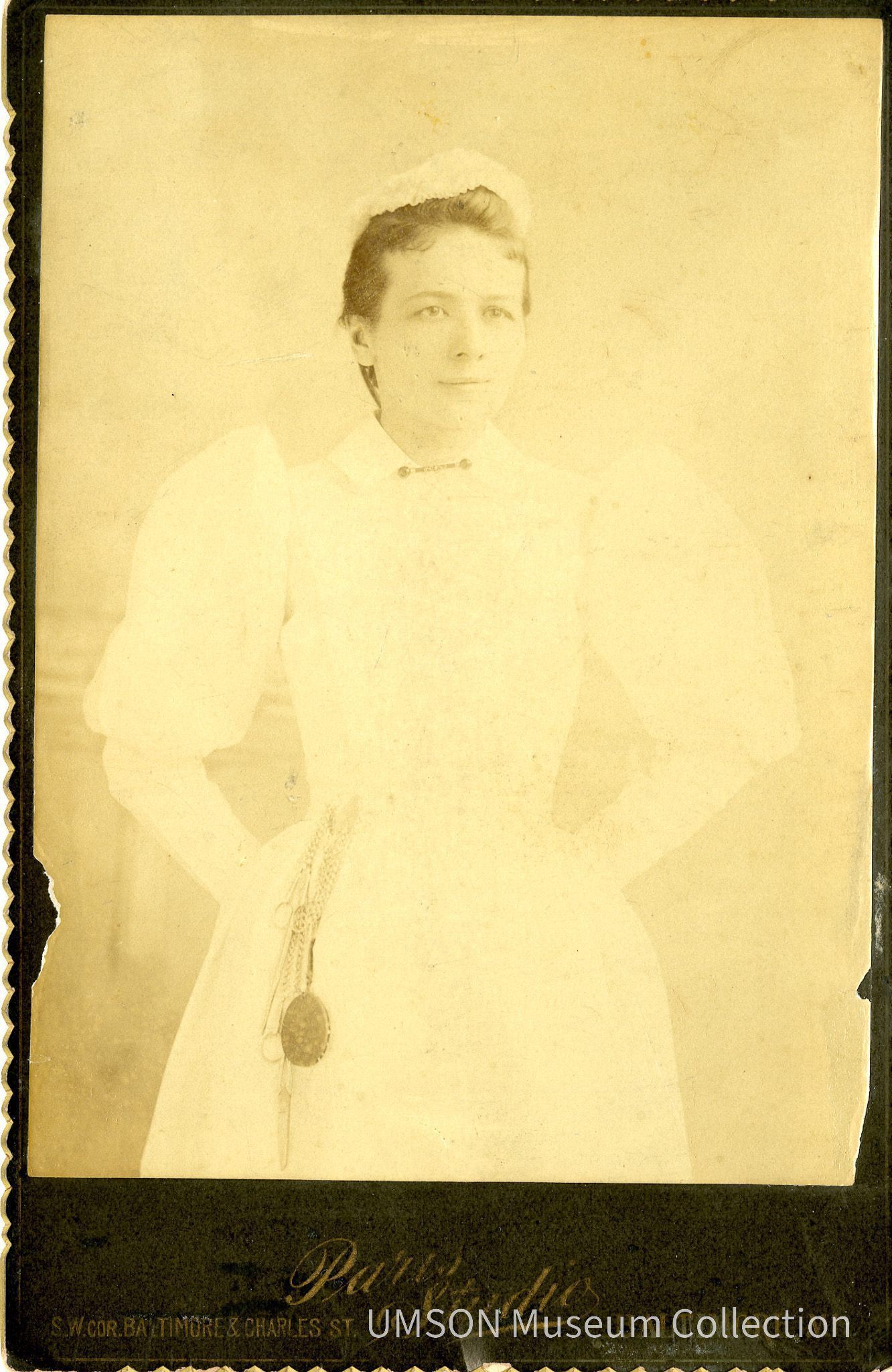 Cabinet card photograph of Eleanor Mayes, class of 1893, wearing graduate uniform. She is wearing a flossie, and long white dress with long tight cuffs. She carries a brush, watch, and scissors on a chatelaine suspended from belt and a bar pin at the dress collar.Acquisition