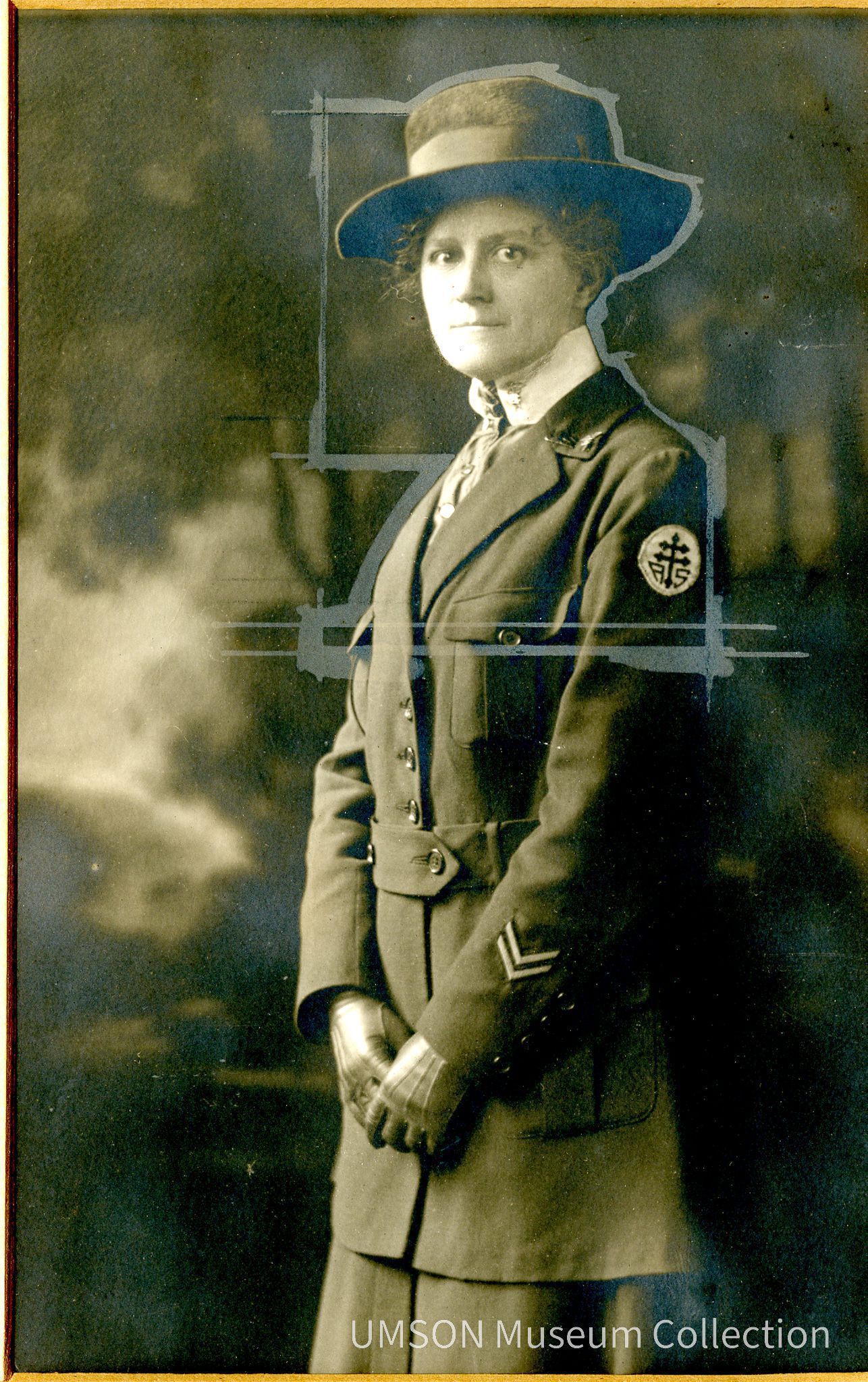 Platinum toned print of Elizabeth Collins Lee in WWI US Army Nurse Corps uniform with hat and leather gloves. Portrait is three-quarter length. Photograph was enclosed in the base of the medal case.Collection