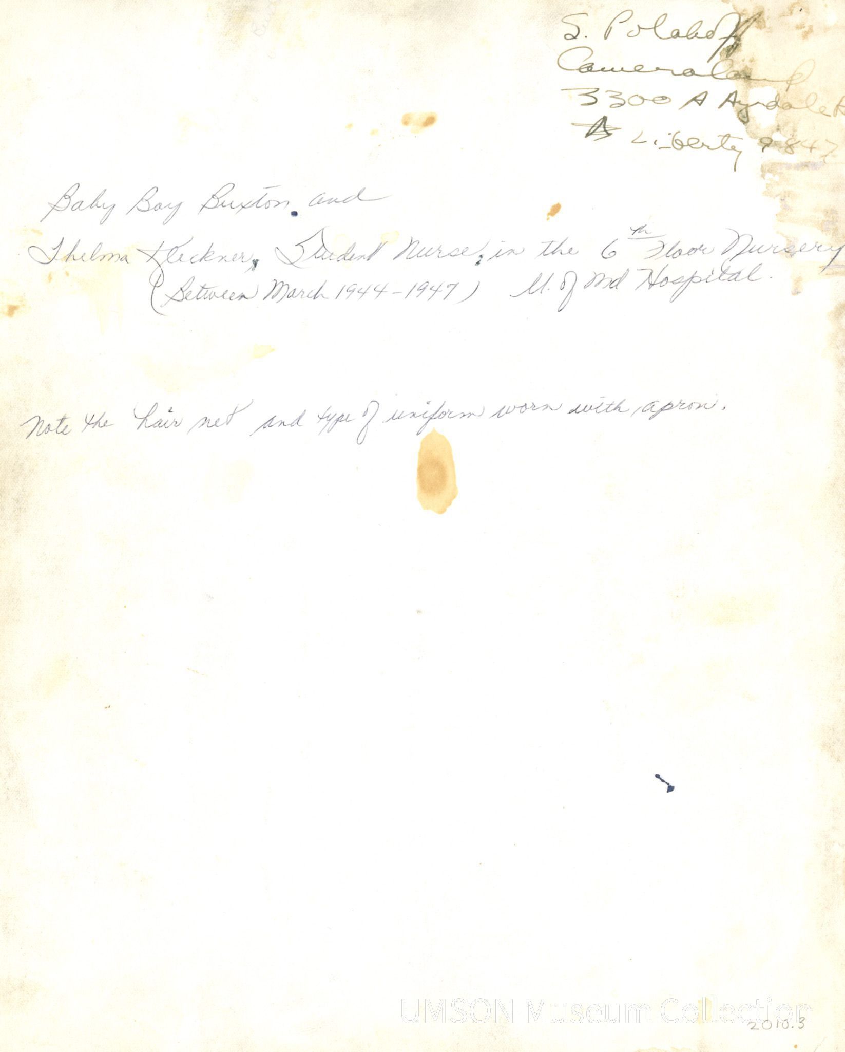 Thelma Kleckner, student nurse in the 6th Floor Nursery, University of Maryland HospitalEntry/Object ID