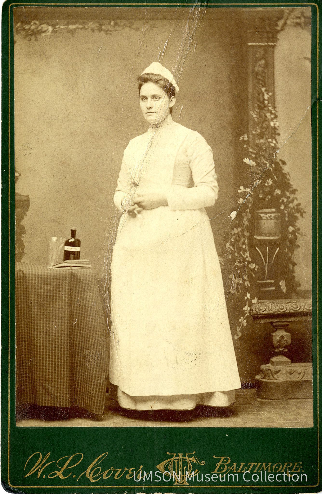 Cabinet card photograph of Clara Mergardt (DIN 1893) in her student uniform of a long-sleeved pinstripe dress with white cuffs, white cap, and a long white apron. She is standing beside a table with a glass, a book, and a bottle of medicine.Collection