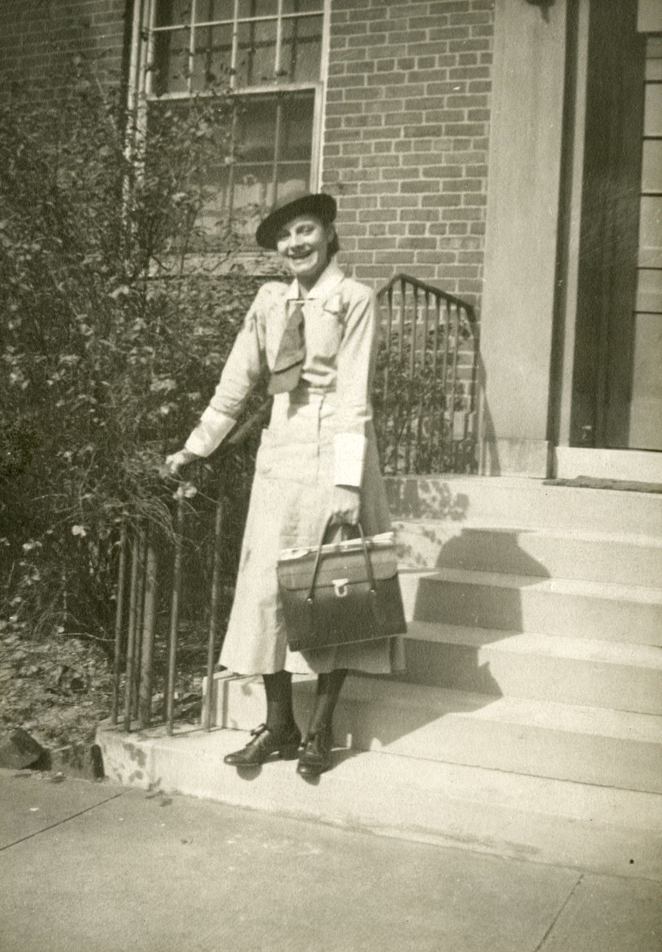 Jane I. Slick (DIN 1937) in a student uniform of a striped dress with deep white cuffs and collar, standing on marble steps carrying a public health nursing bag. Verso, in pen: Jane I. Slick | 1st Nurse to have | Public Health Course | at University School | of Nursing.Photograph Details