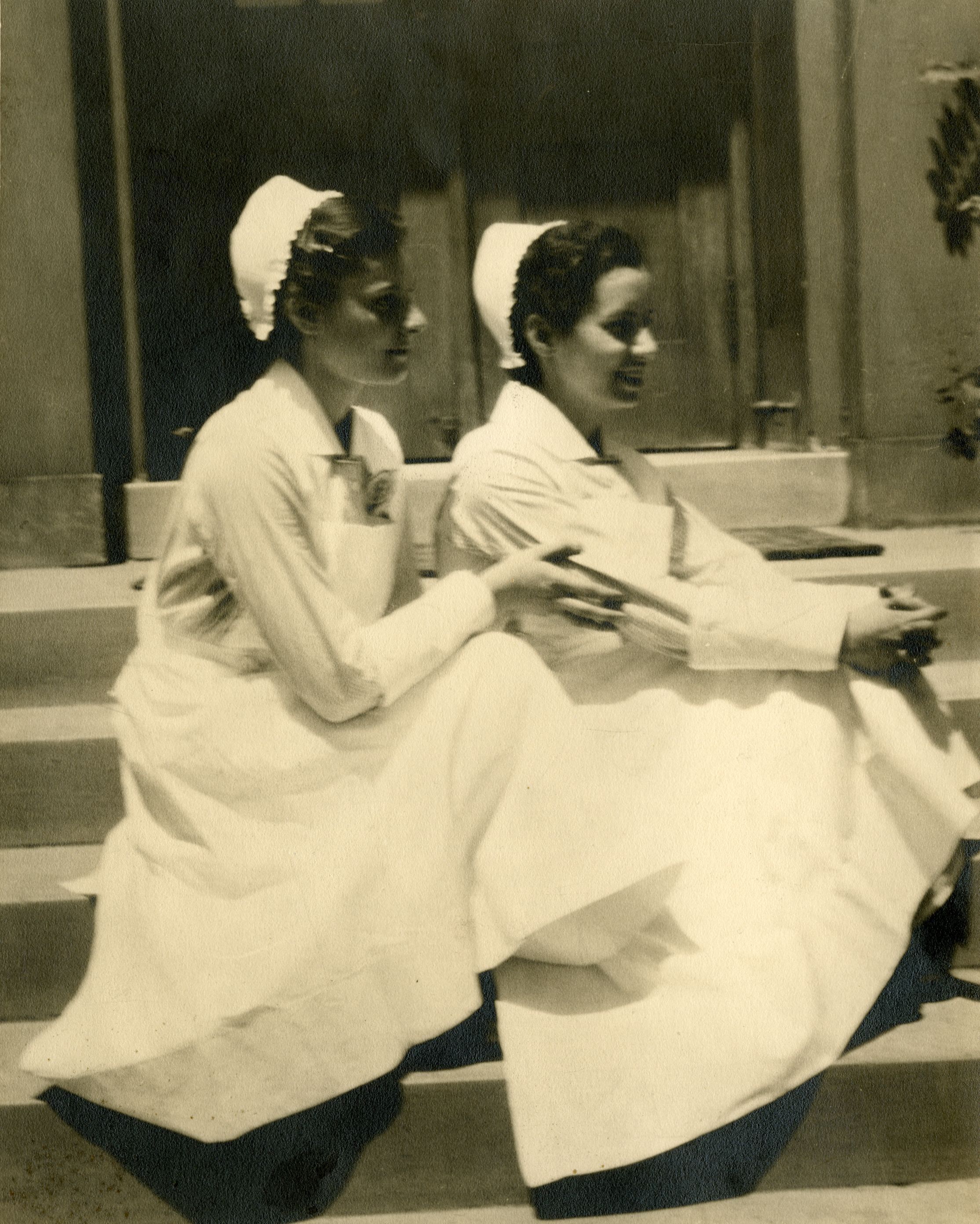 Portrait of Jane I. Slick, DIN 1937 and Edna E. Sutton, DIN 1937 Both students are seated on the steps of a building, dressed in striped student uniforms with deep white cotton cuffs, aprons, and student caps.Photograph Details