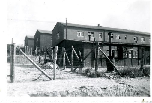 Wooden barracks buildings behind electrified wire fence, Buchenwald, 1945. Deckle-edge print of snapshot taken by Doris Whitehurst.Photograph Details