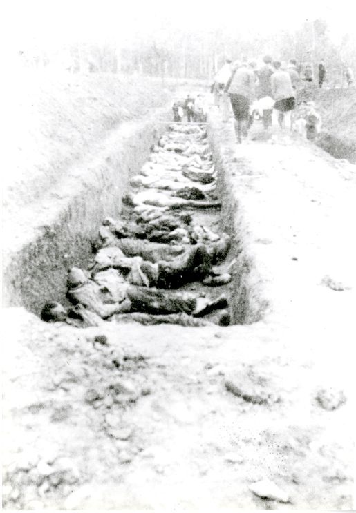 Corpses in a mass grave at Buchenwald, May 1945. This may be a grave dug by German civilians of Nammering under orders of American military authorities.Photograph Details
