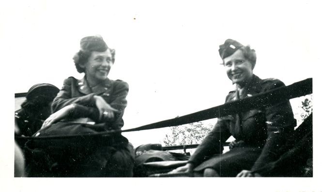 Left, Bea Abrahamson, right, Doris V. Whitehurst, DIN 1935, in Army Nurse Corps uniforms and garrison caps.Photograph Details