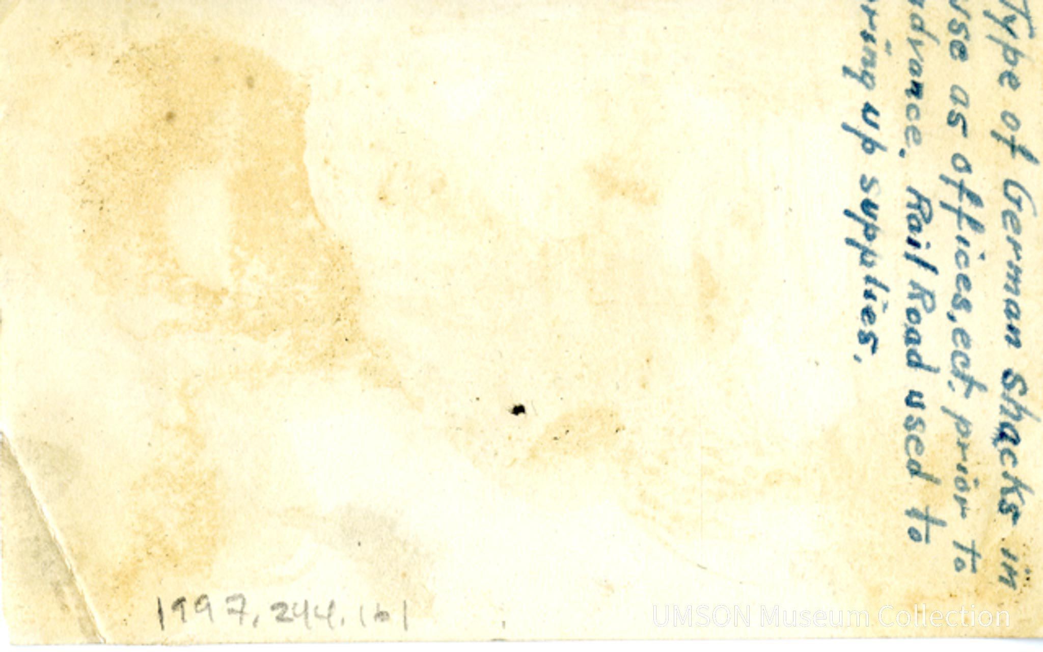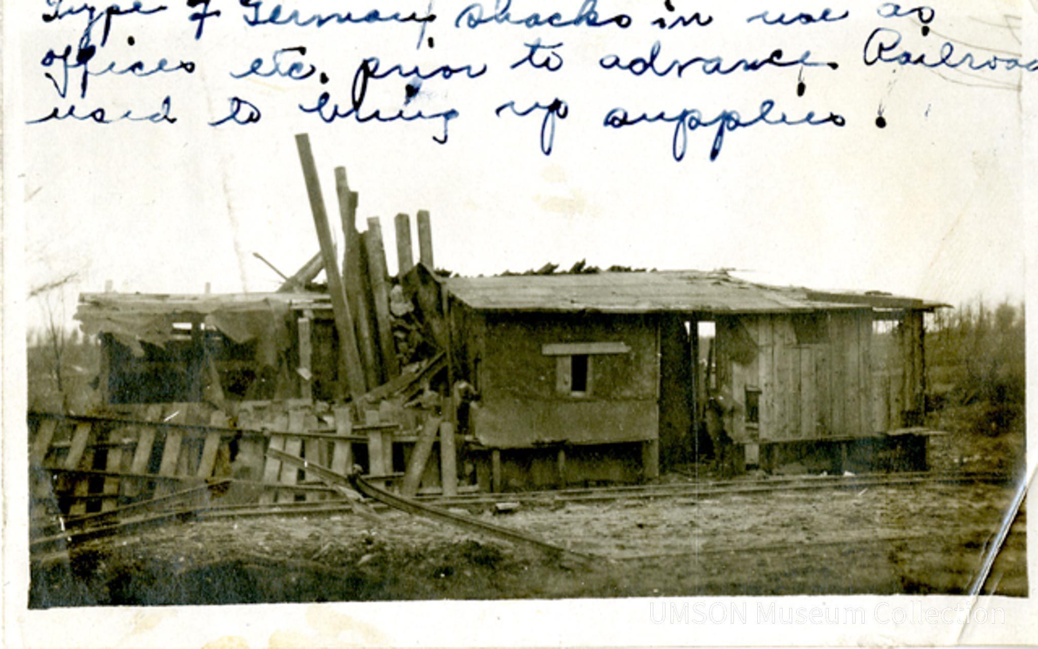 A partially demolished wooden building with one window and a large central aperture or door stands in a barren landscape. Twisted railroad tracks still attached to sleepers lie in the foreground. Large timbers lean against a corner of the building. A note in ink written across the top of the image reads, " Type of German shacks in use as office etc. prior to advance, Roadroad used to bring up supplies." Probably taken near Charney-sur-Meuse, a village near Verdun partially destroyed in the Meuse-Argonne offensive of September - November 11, 1918.Photograph Details