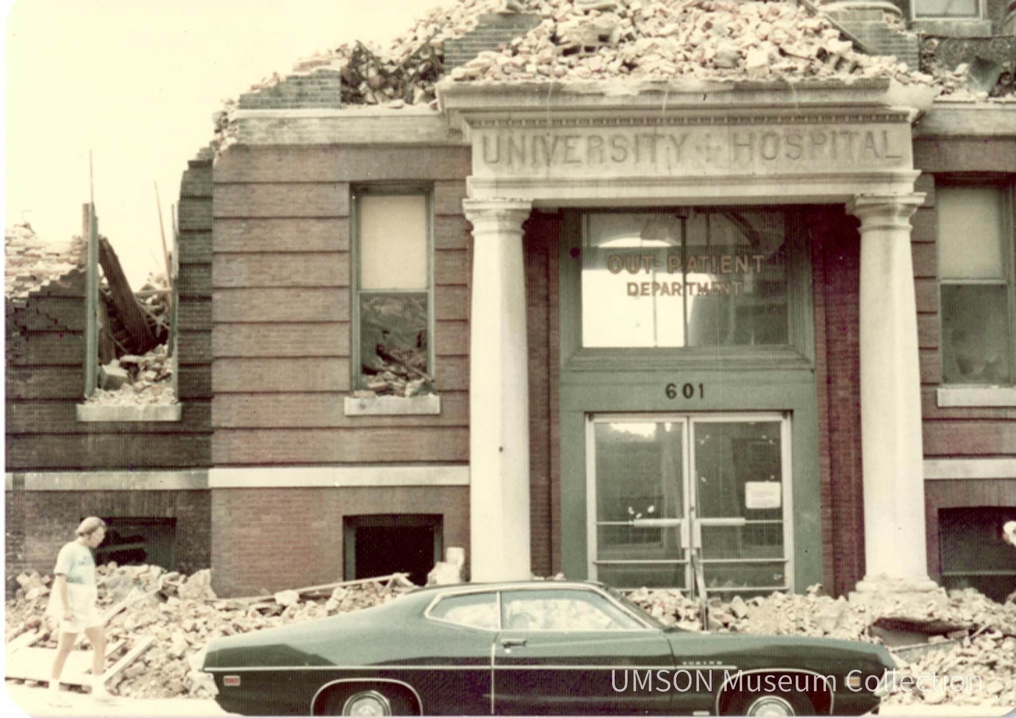 Snapshot of the entrance to University Hospital Out-Patient Department, 601 West Lombard Street, showing the entrance columns surmounted by rubble and a crumbling wall. A green coupe is parked in front of the doorway, while a pedestrian walks on the sidewalk next to the pile of rubble.Photograph Details