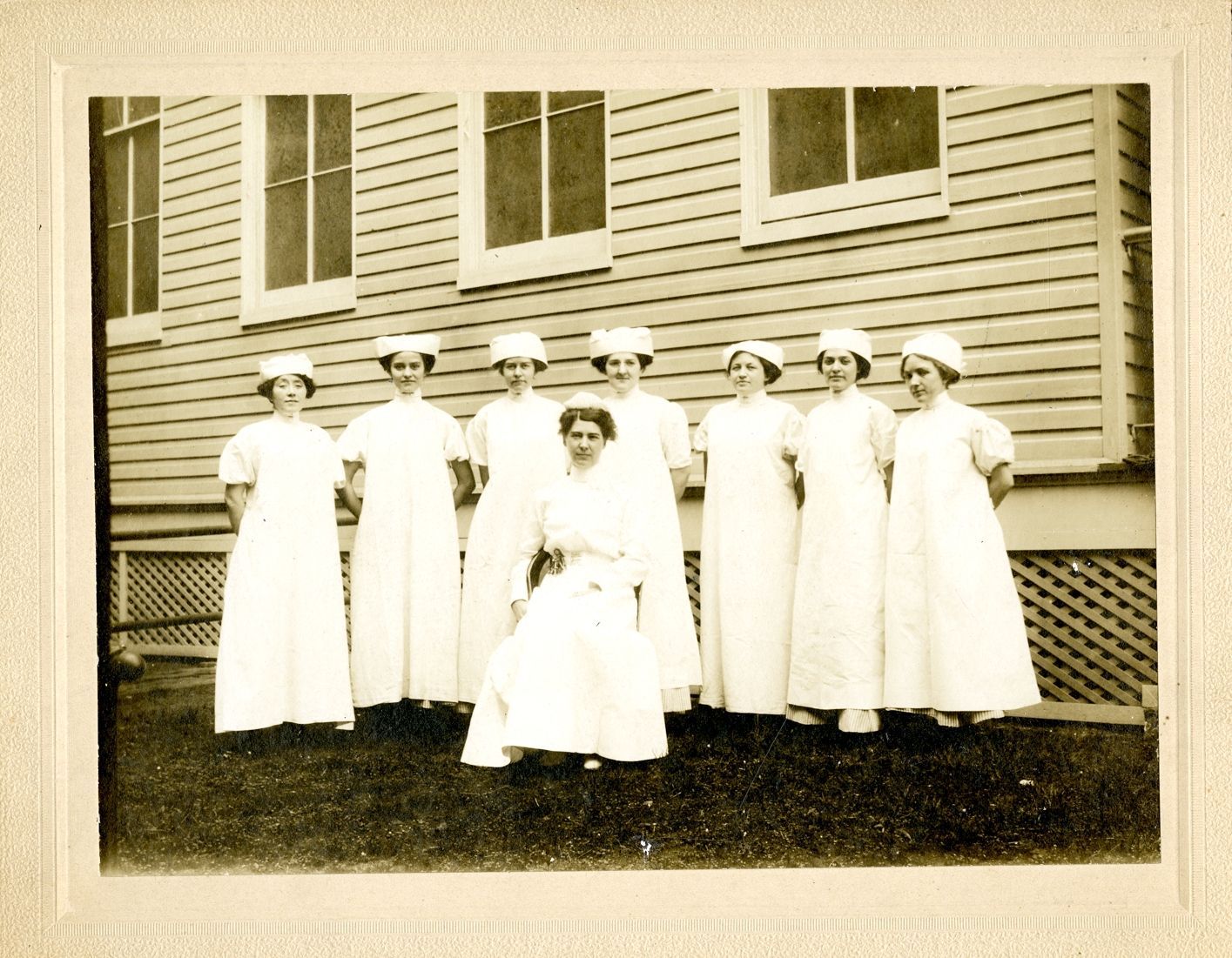 Seven nurses, arms bent and hands behind their backs, in white surgical gowns and caps, stand behind a graduate nurse in white uniform and Flossie cap.Photograph Details