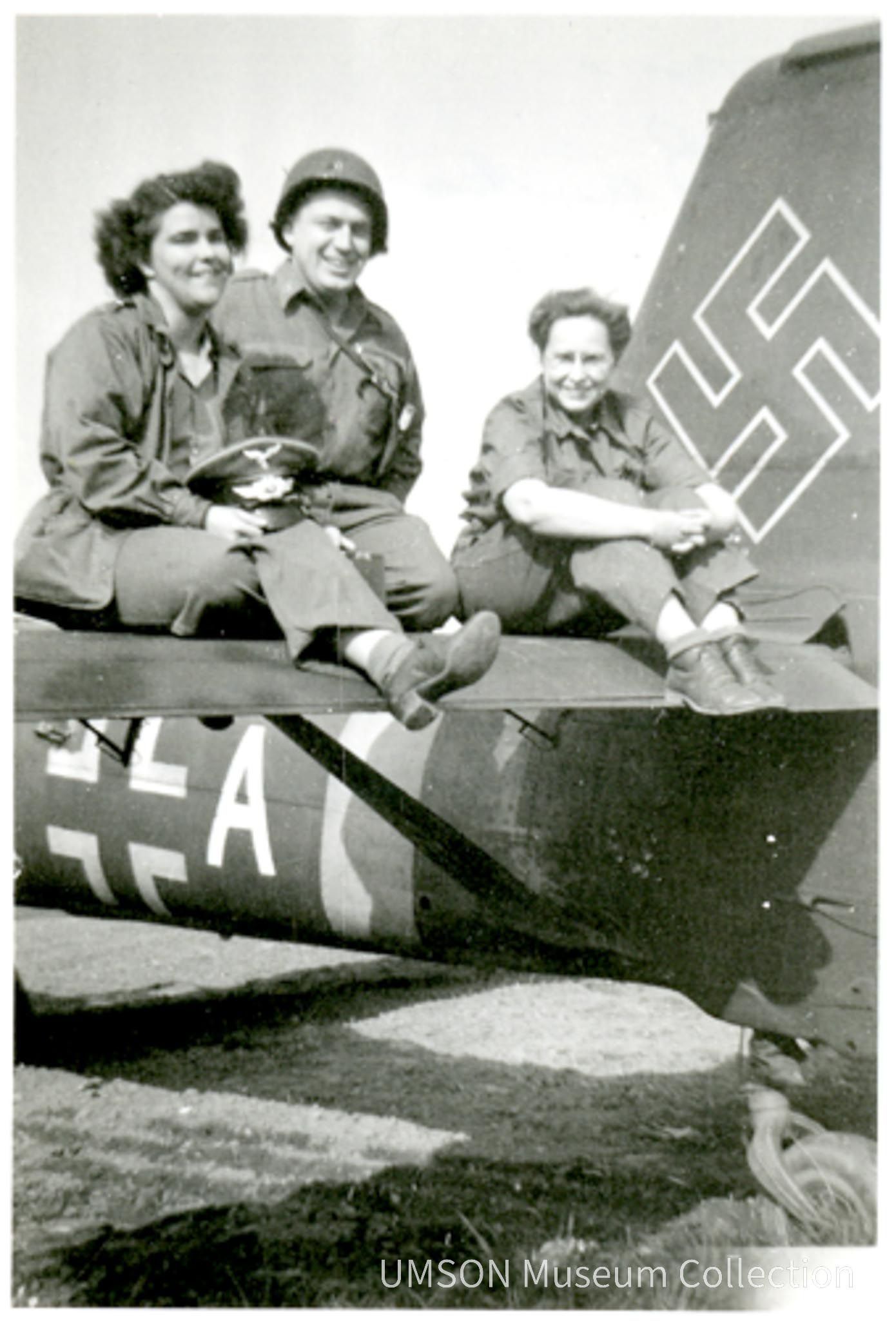 Snapshot of two nurses and a U. S. soldier on the tail of a Stuka (Nazi dive bomber). 2nd Lieutenant Doris V. Whitehurst (DIN 1935) is seated at right, closest to the tail. Mac and Banks remain unidentified for now. Snapshot printed on deckle edge paper.Photograph Details