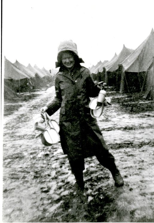 Photograph of a woman in a slicker and hood standing in a muddy "street" between U. S. Army tents, holding mess kits and canteens. Camp Lucky Strike was designated “RAMP Camp No. 1” and was the chief assembly point for newly-liberated American prisoners of war, or RAMPs [Recovered American Military Personnel.]Photograph Details