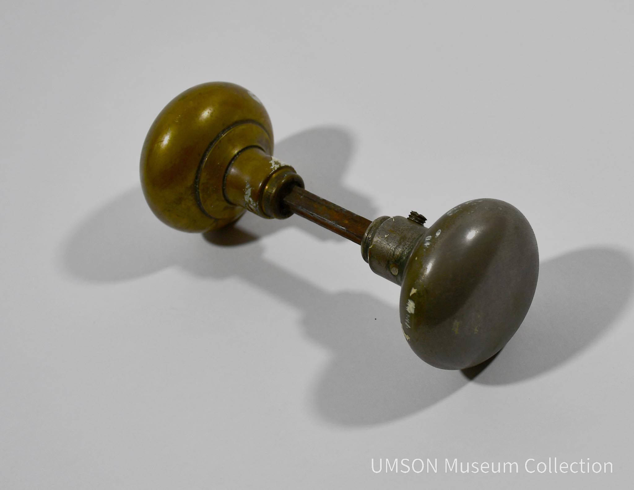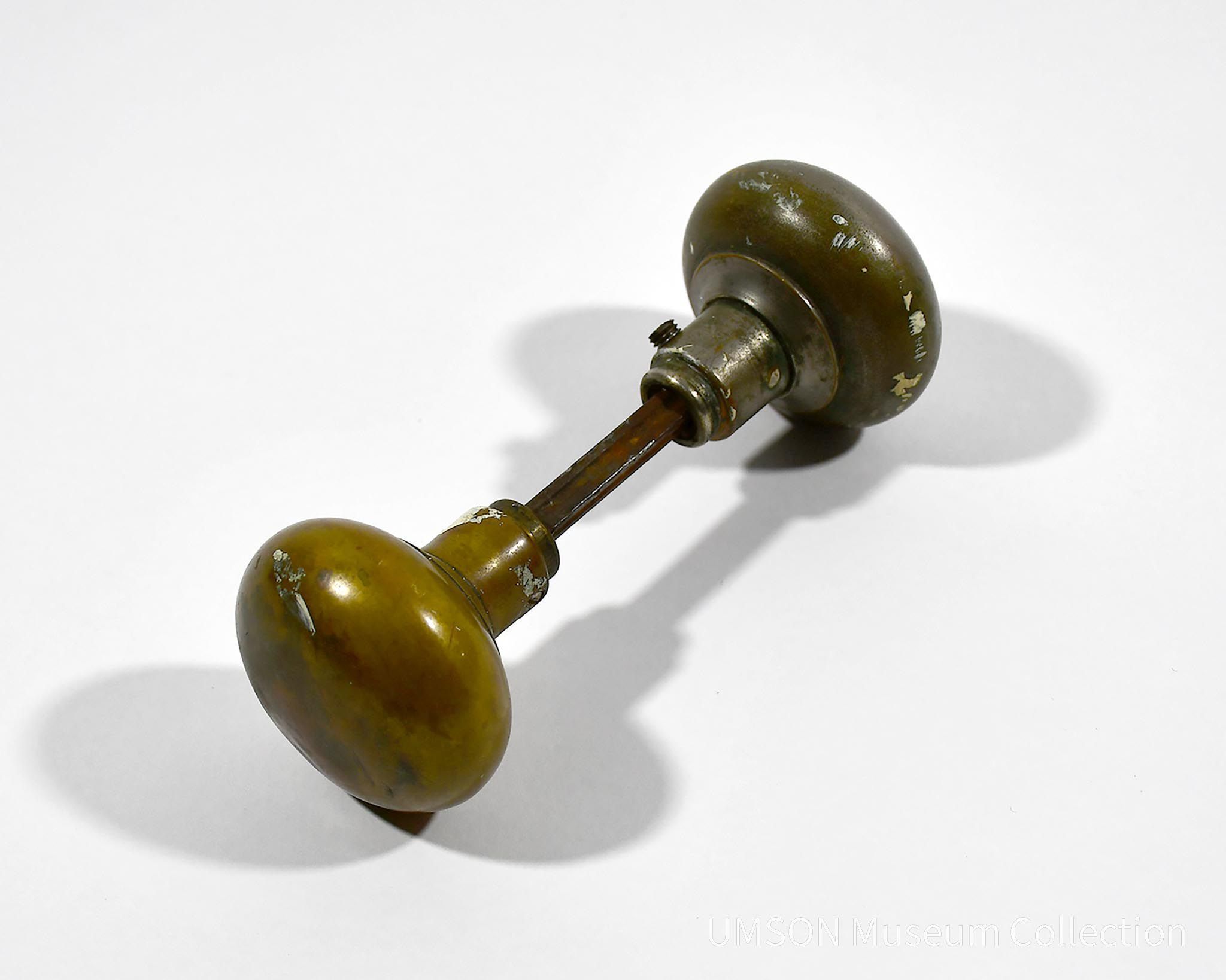 Brass doorknob with ovoid handles. Two knobs on either end of a shaft. Removed from Parsons Hall by Shirley J. Lentz as a student in the 1950s.Acquisition