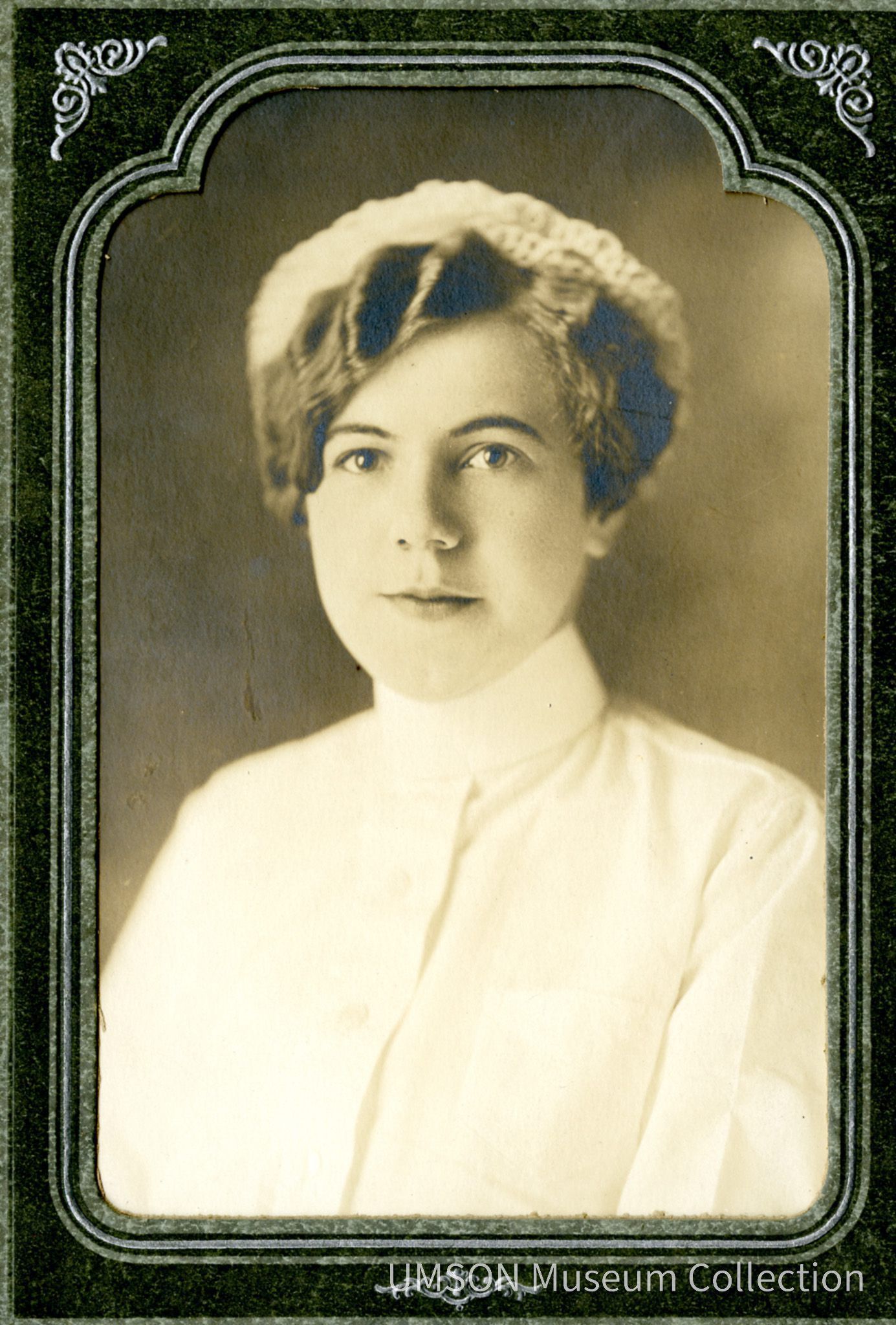 Portrait of Beatrice L. Krause in "Flossie" cap and high-collared white graduate uniform. Housed in folding cardboard frame that converts to a stand.Acquisition