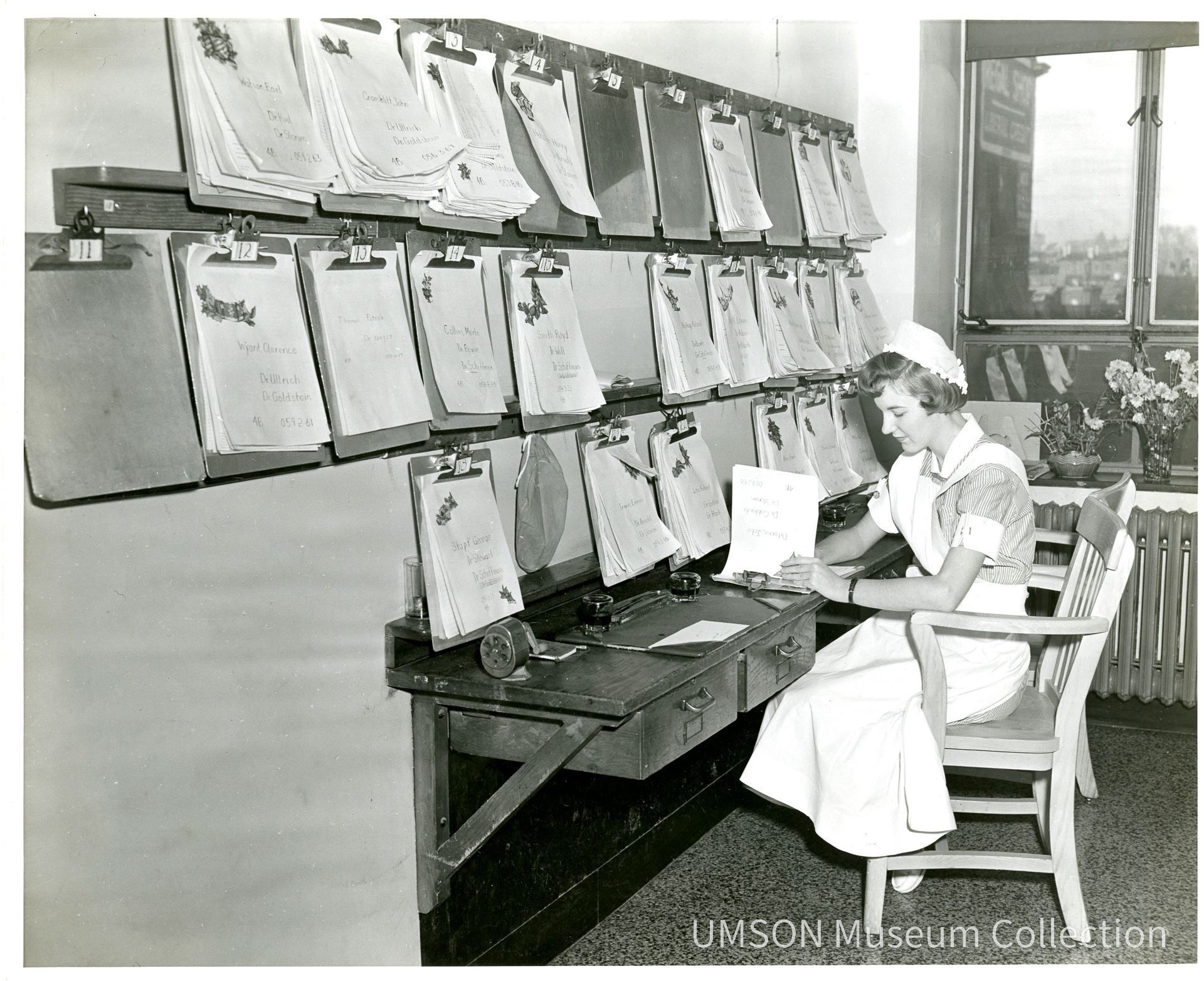 Student nurse in short-sleeved striped uniform, white apron, and cap seated at a counter updates charts held on clipboards. 26 clipboards hang in three rows on the wall in front of her. At the back of the room, a casement window provides a view of downtown Baltimore and a painted wall sign for "Regal Shop," which was located in the 600 block of West Baltimore Street. 8"x 10" paper wioth narrow border. Identified on verso with 1956 yearbook placement.Acquisition
