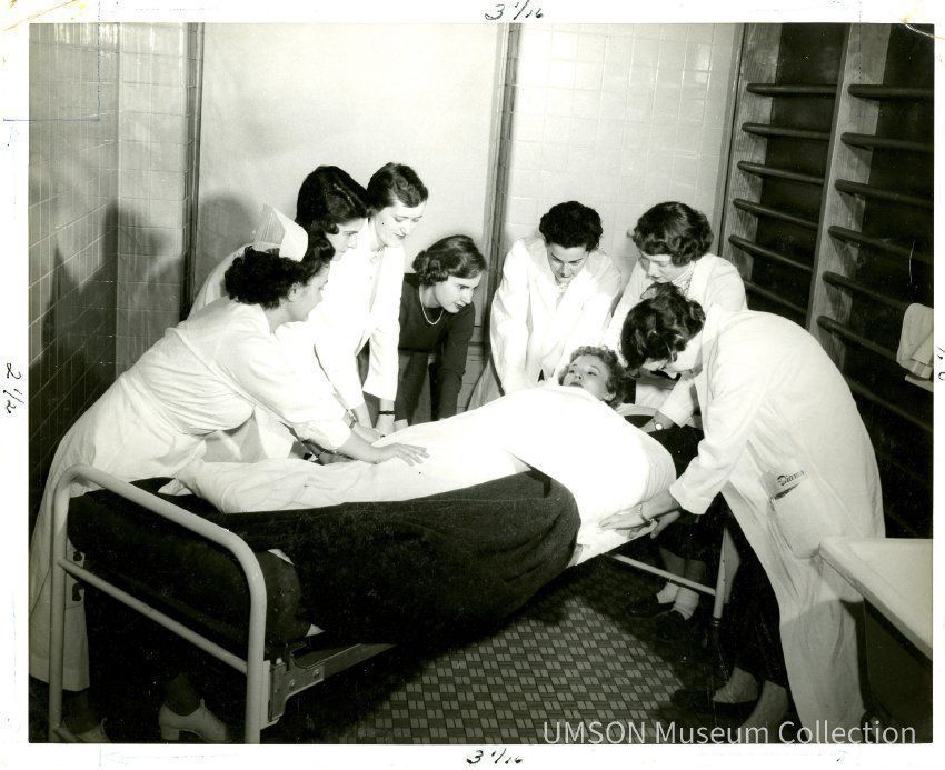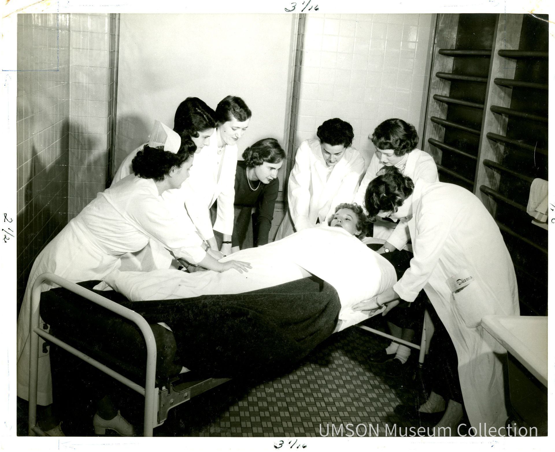 Seven young women, including fice students, a nurse and an instructor, lean over a "patient" restrained in a hospital bed by a wrapped sheet. The "patient" is portrayed by a student volunteer. The other students are dressed in white clinical coats over street clothes. On the right, a student has a folded copy of "The Diamondback" UM student newspaper in her coat pocket. 8' x 10' black and white photographic print with narrow border, identified on verso with placement in 1956 yearbook.Acquisition