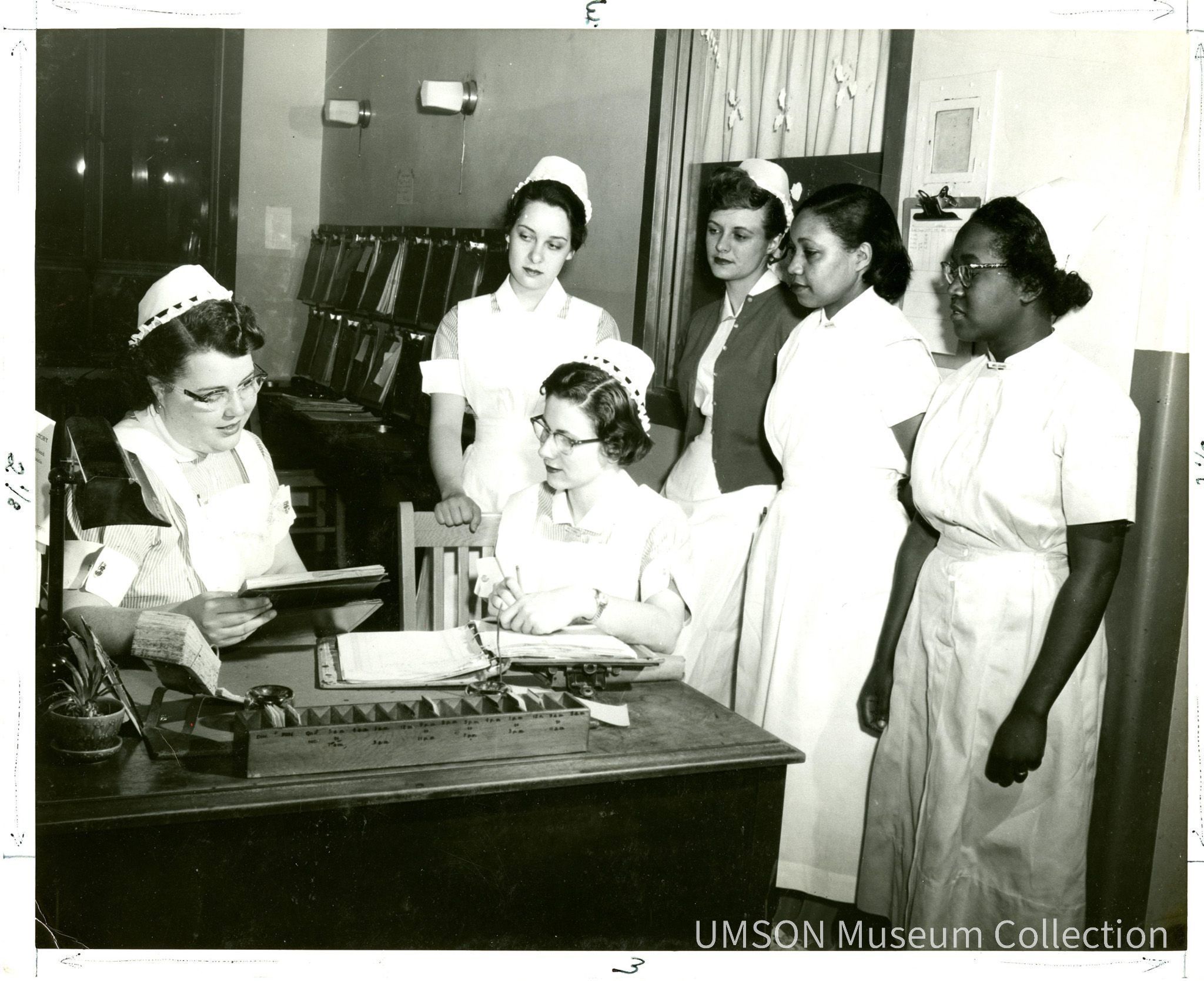 Two senior student nurses seated at a table discuss patients and assignments while two junior students and two Black nurses or assistants look on. 8" x 10" black and white photographic print with narrow border. Indentified by donor "Senior nurses in charge with students-- getting assignments. There were RNs- not that many, 10th floor, VIP floor- students didn't work there."Acquisition