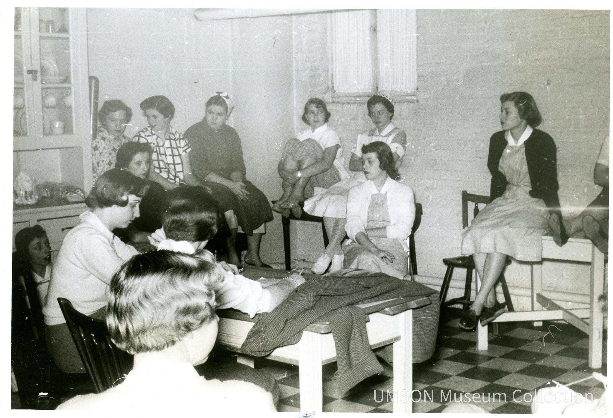A group of twelve young women in casual clothes, along with two women in nursing student uniforms, seated in the basement kitchen at Parsons Hall. Two are seated at a table, backs to the camera; others sit on counters and tables, while one sits in a chair. 5" x 7" black and white photographic print with narrow border, identified on verso with location in 1956 yearbook. The kitchen was open 24 hours a day, stocked with bread, eggs, and juice.Acquisition