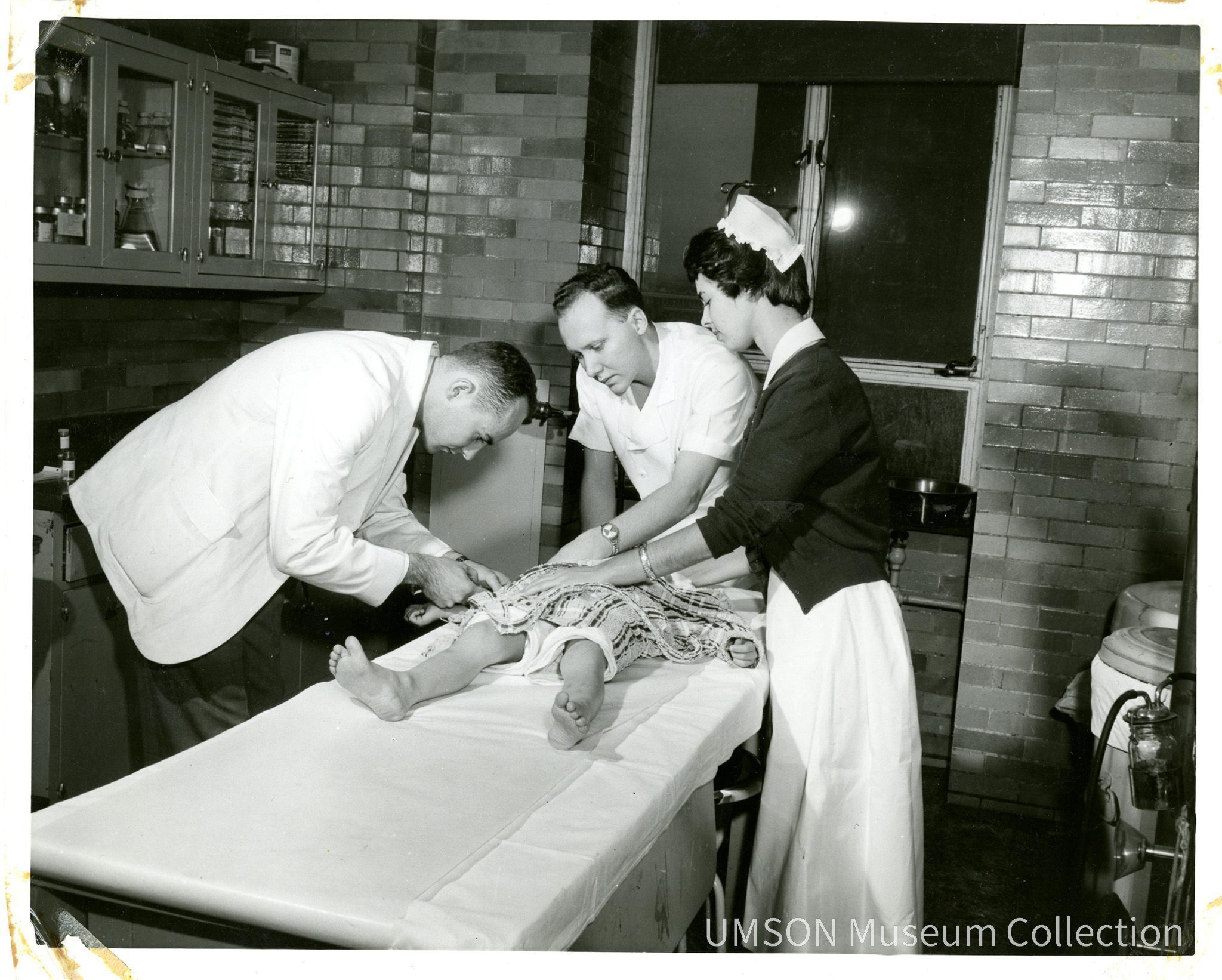 Student nurse, attending physician and resident treating a pediatric patient lying on a stretcher in the University Hospital Emergency Room. 8" x 10" black and white photographic print.